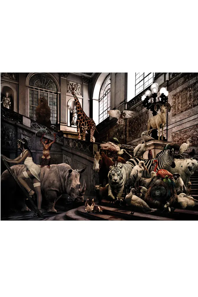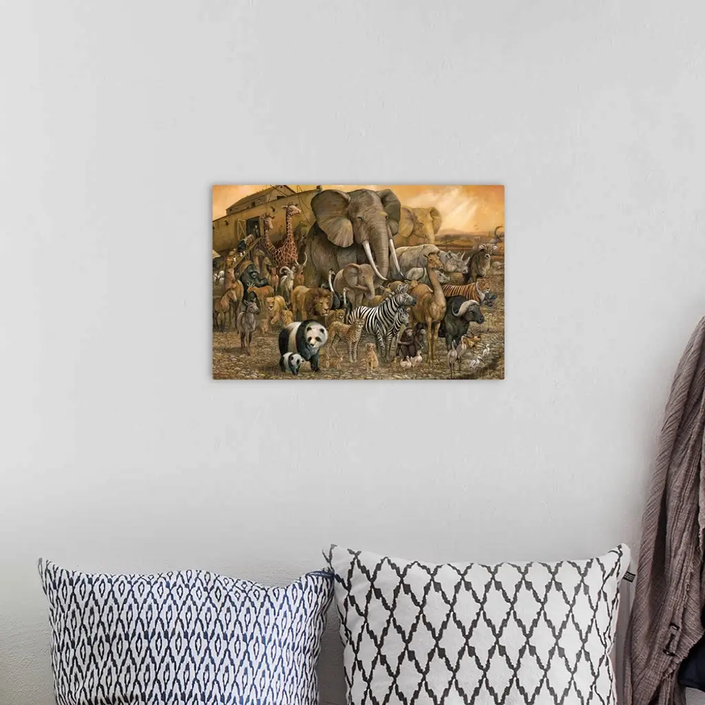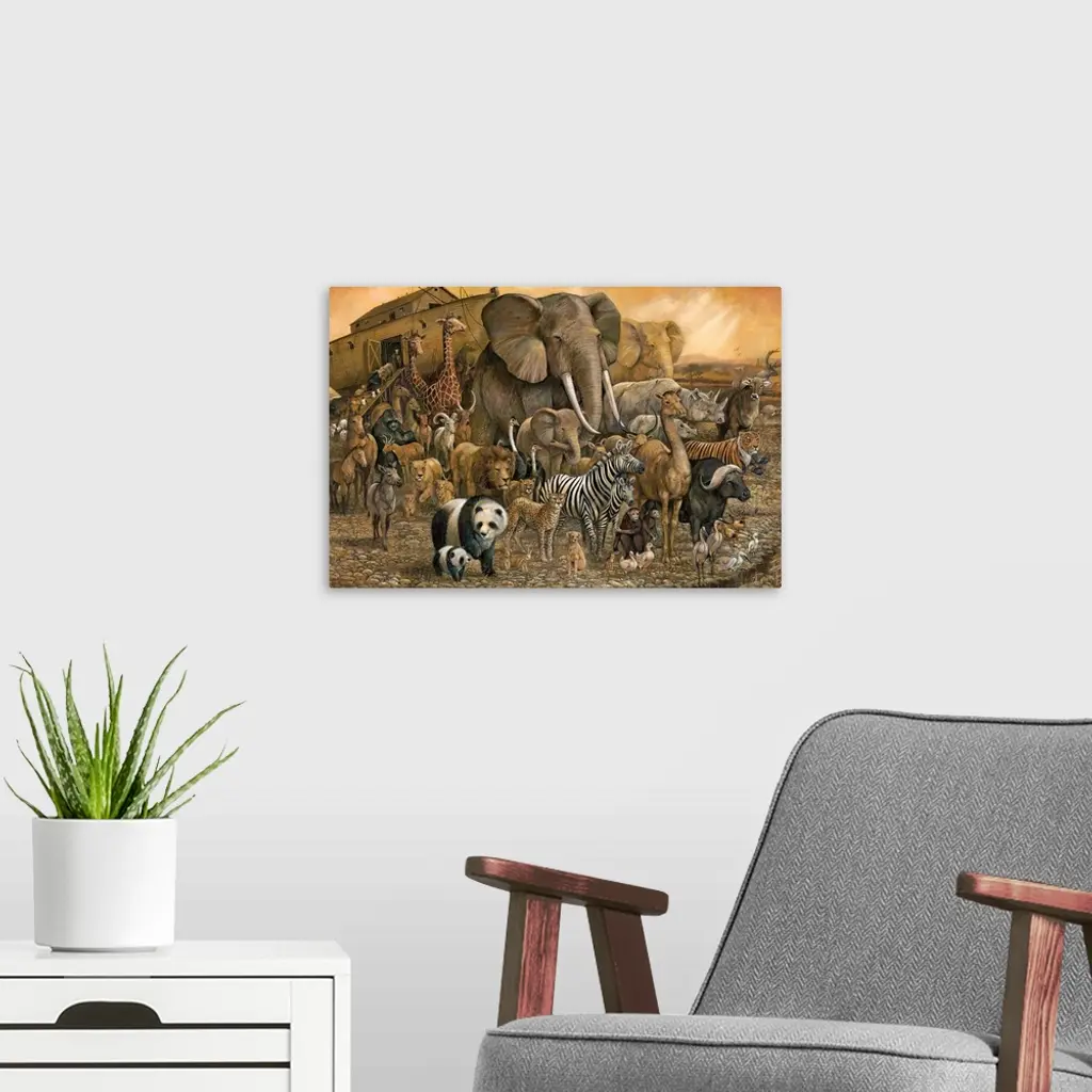 Painting of Noah's Ark and a large group of different animals in brown tones.