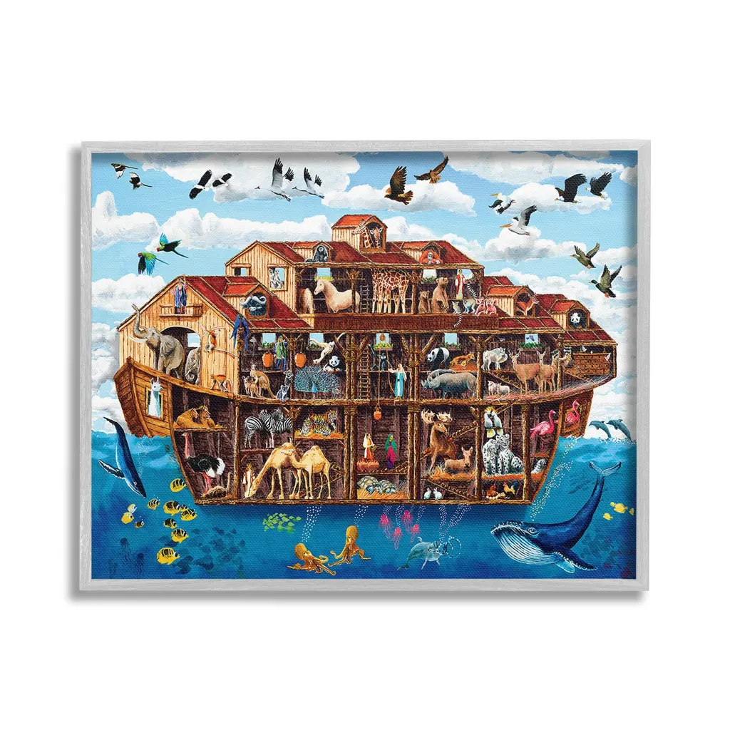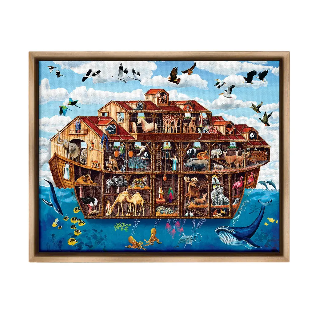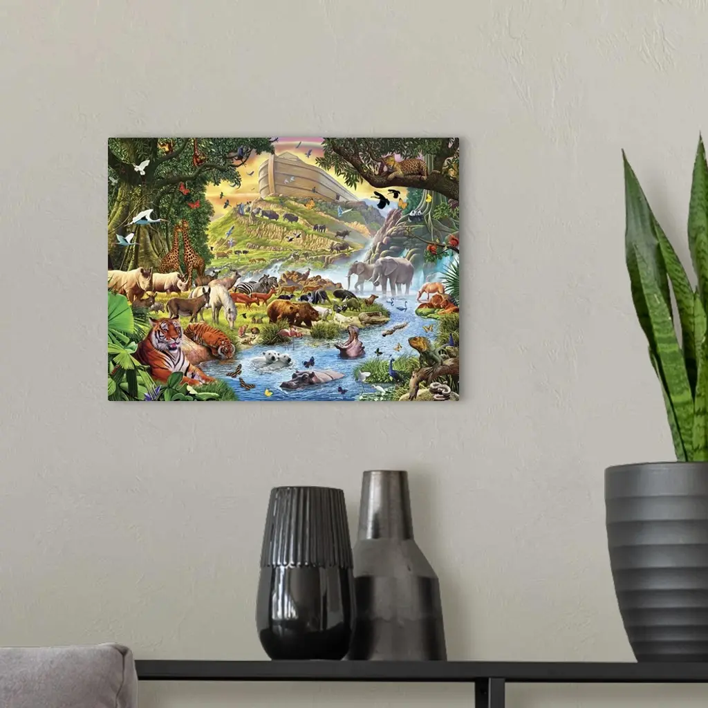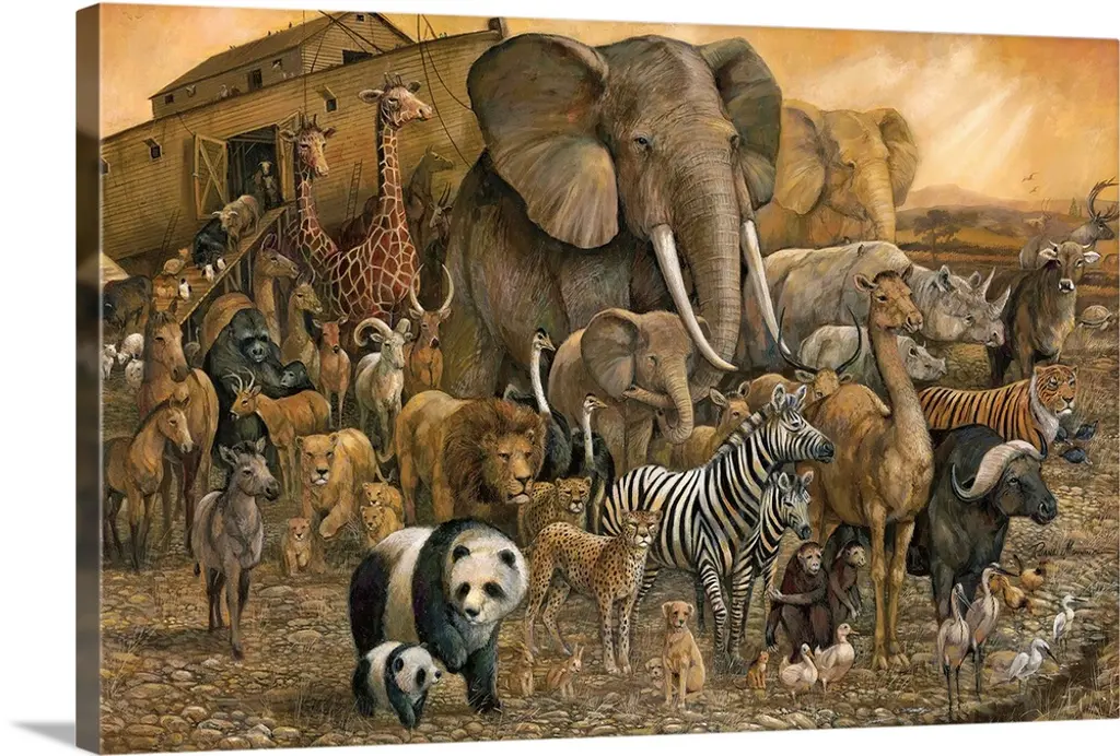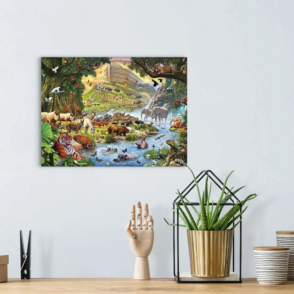 Colorful artwork of Noah's Ark in a lush green landscape with thousands of animals all around.