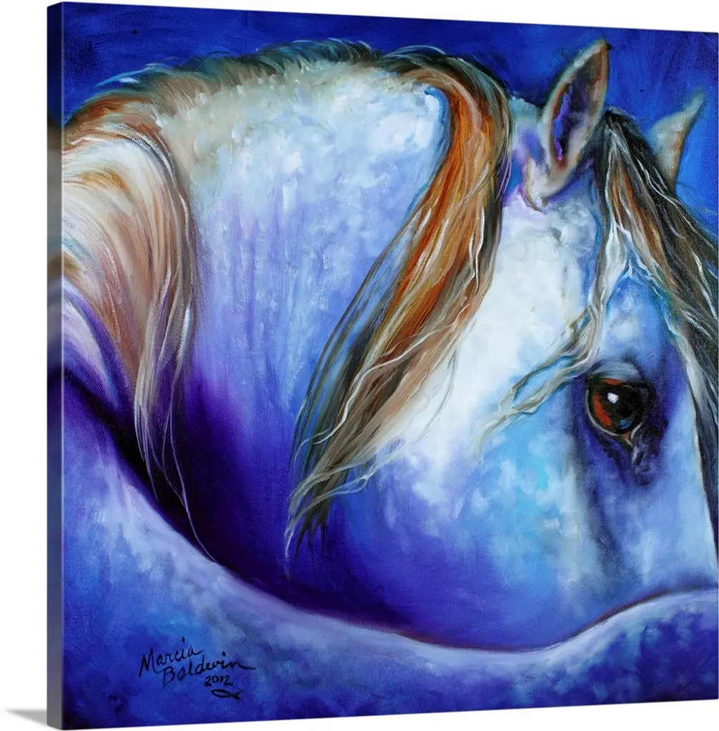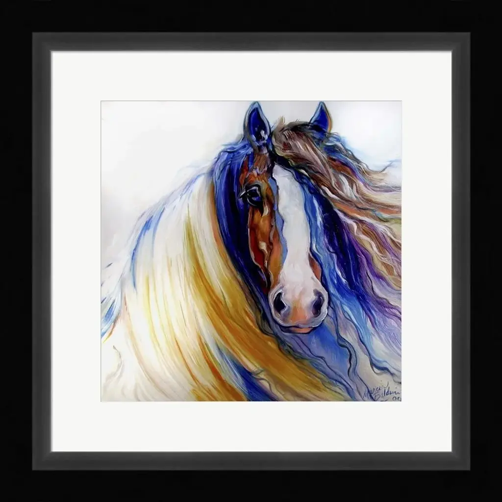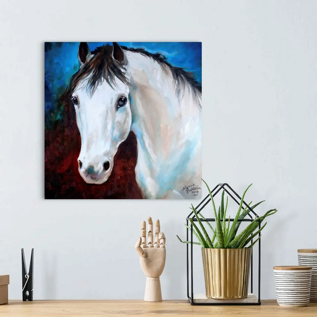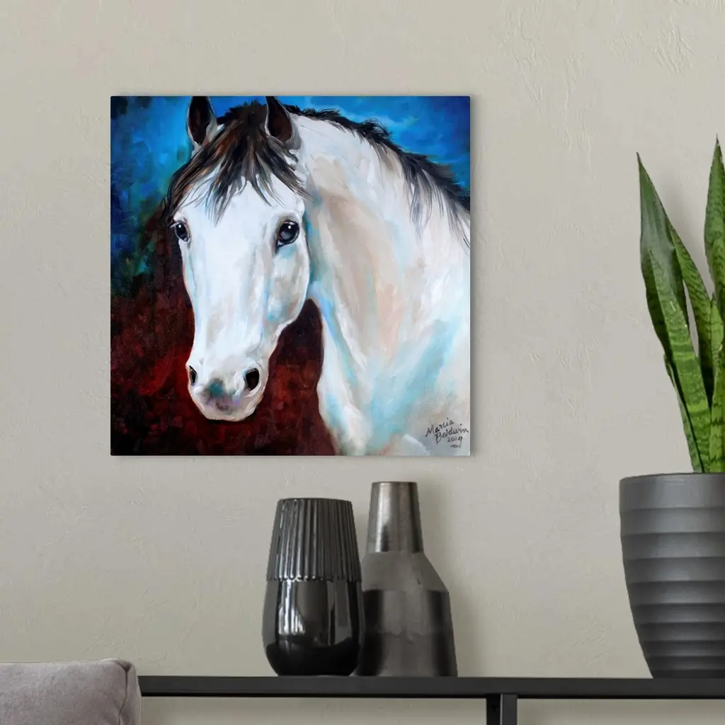 Painting of a white horse with a black mane on a dark red and blue square background.