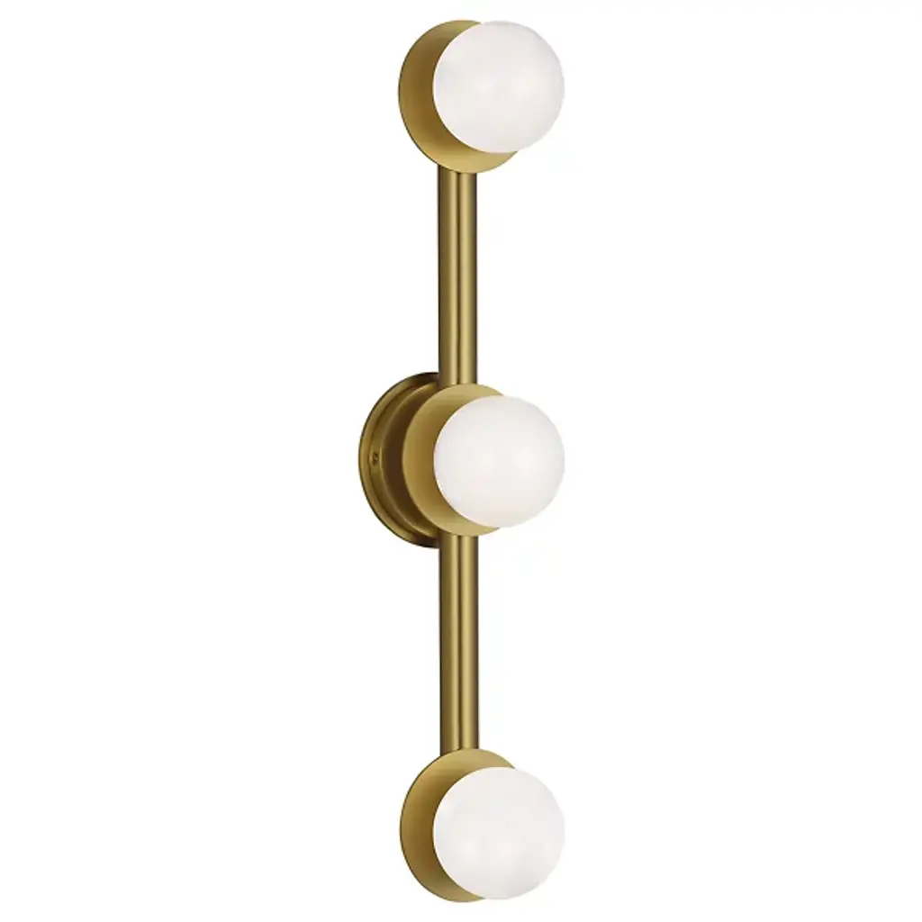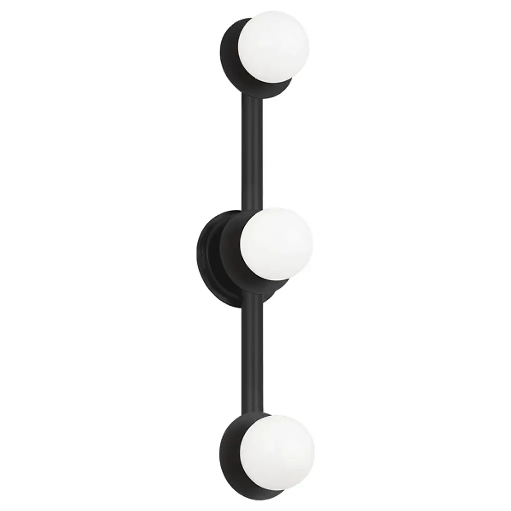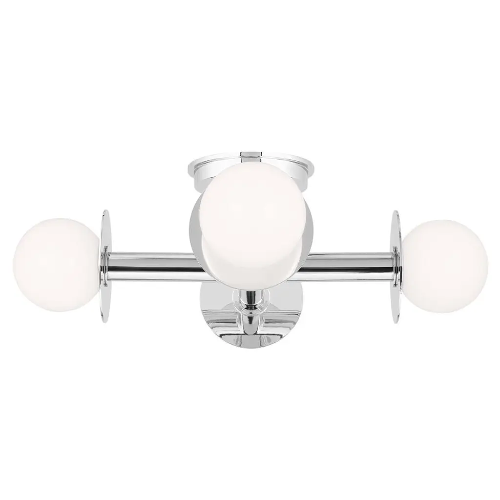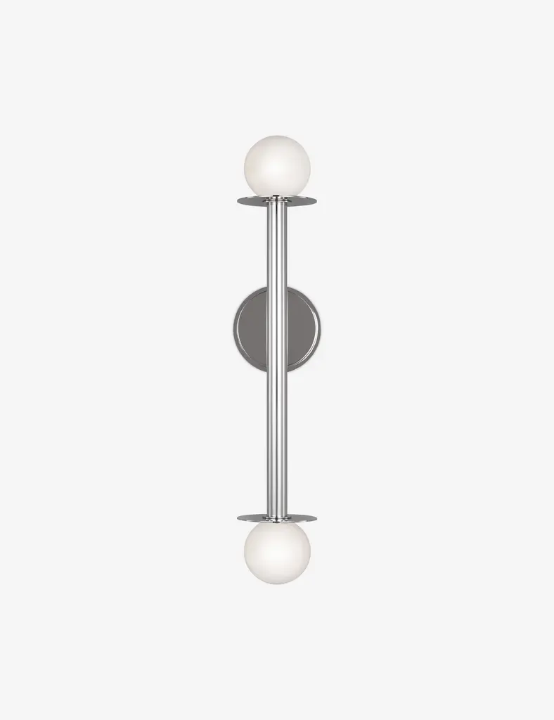 The Nodes Vanity Light from Visual Comfort Studio combines minimalism with bold design, showcasing Kelly’s signature blend of mixed materials and curvilinear forms. Milk glass globes radiate light against metal discs, creating a striking contrast. Each fixture can be used with or without the discs for versatile styling. Hanging fixtures feature black fabric cords, while pivot sconces offer flexible installation options, either as cord-and-plug or hardwired, making this collection both functional and stylish.
