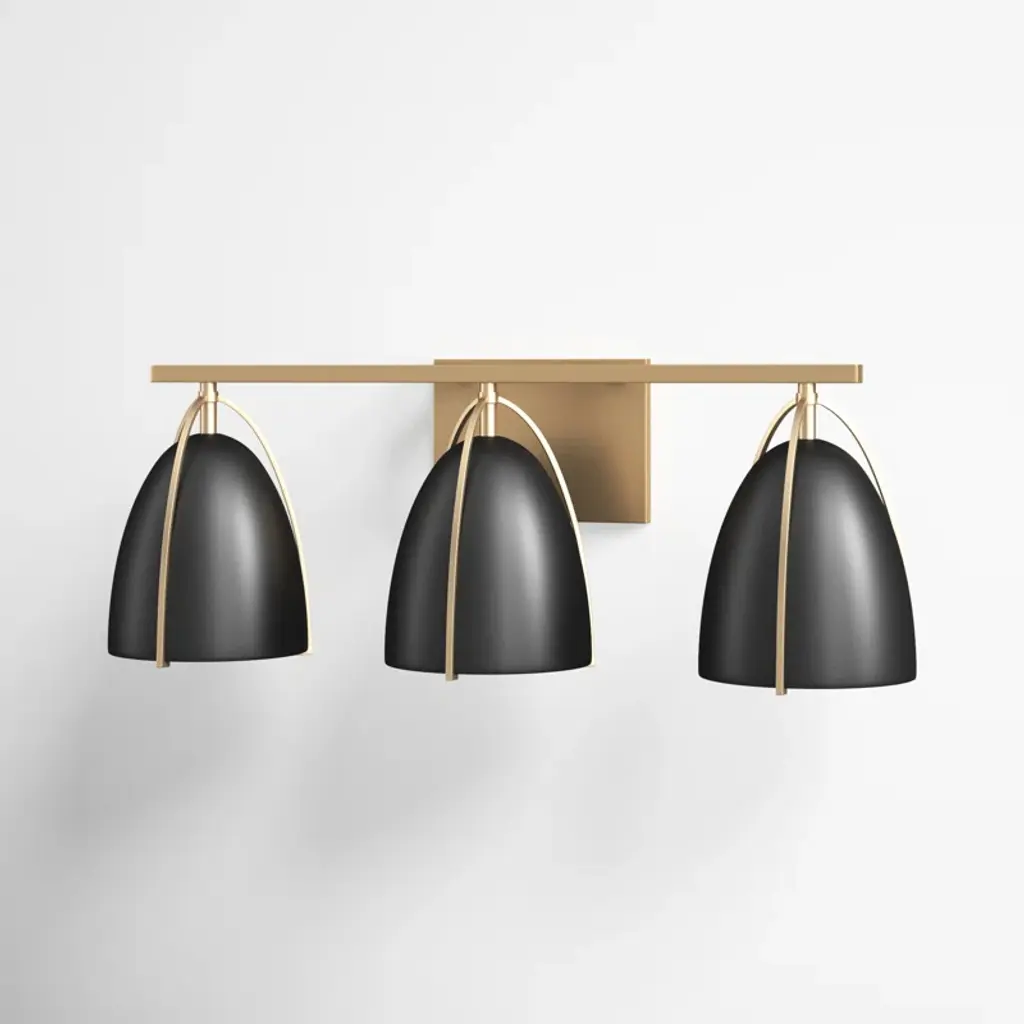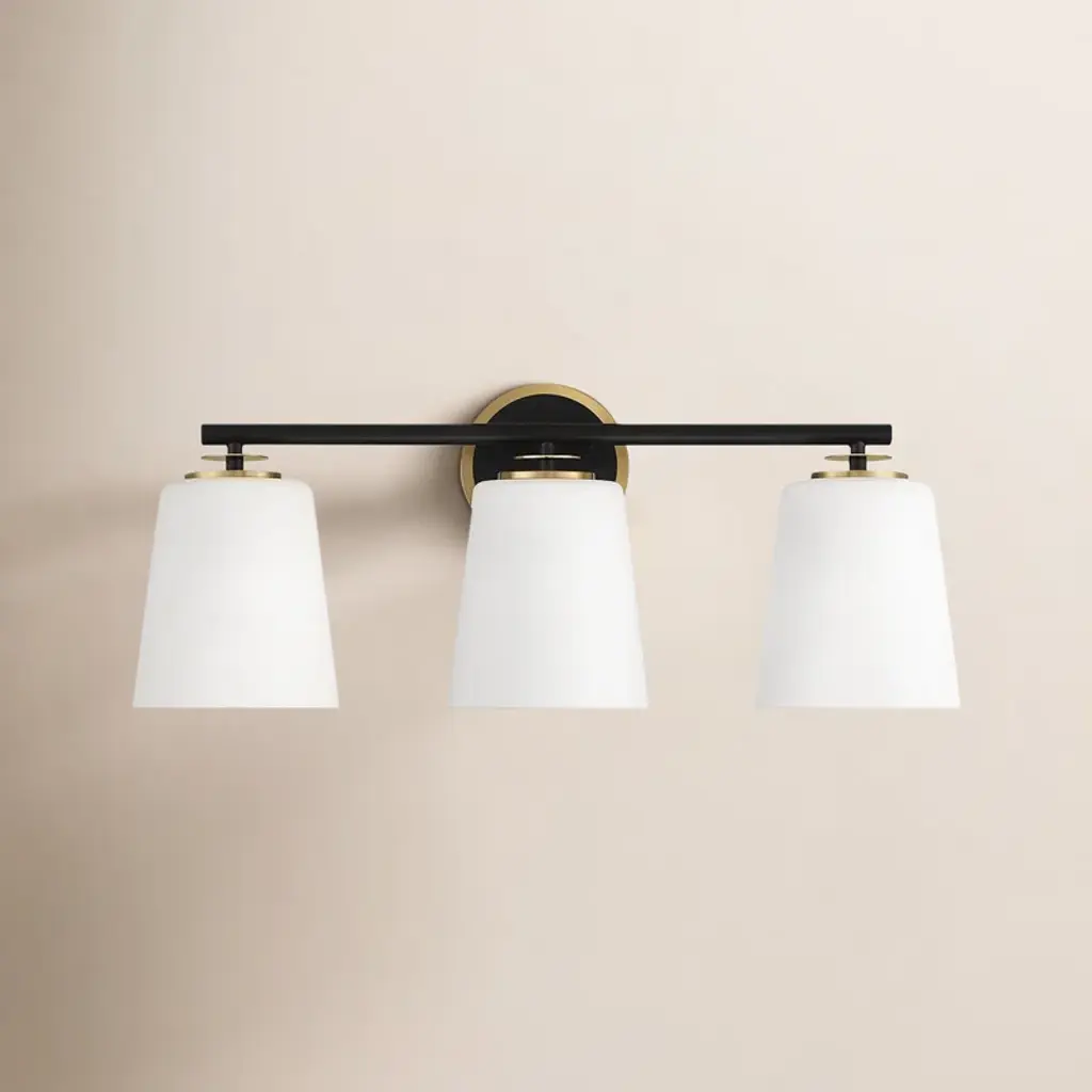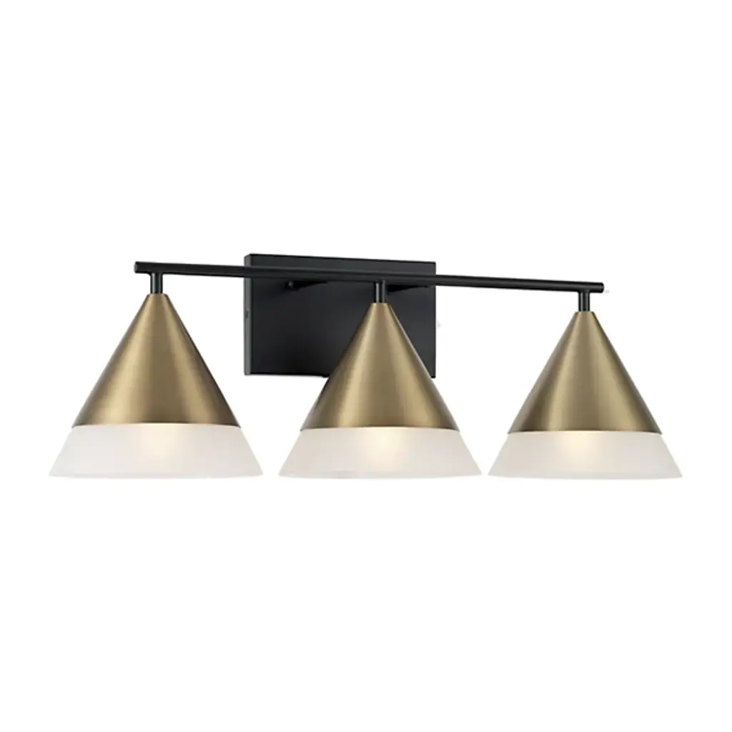 This 3-light dimmable vanity light has a modern, clean-lined design with a dash of industrial influence. Offering an updated take on a classic silhouette, it's made from metal with a frosted white glass shade held inside sleek support arms. This fixture hangs from a rectangular backplate and has a straight support arm. Plus, it's endlessly versatile: It's safe to use in damp locations and compatible with dimmer switches. And best of all, a bulb is included for added convenience.