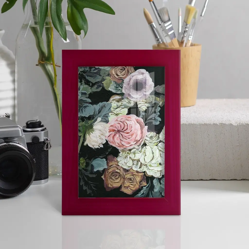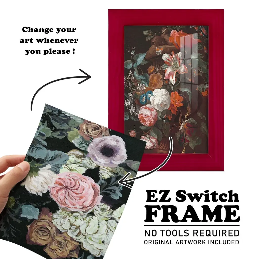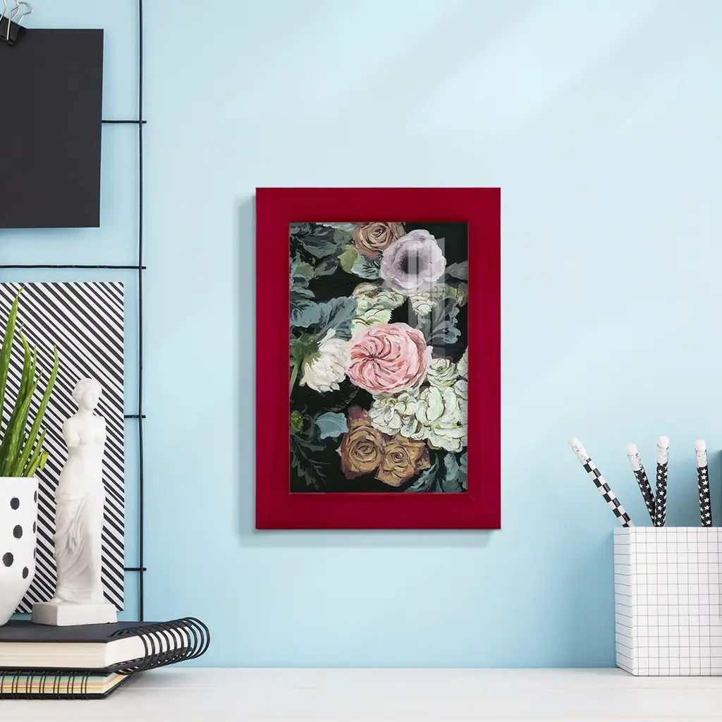 Noir Arrangement II -EZ SWITCH Framed Print w/glass-Cherry Red A delightful, framed print. Featuring a solid wood frame with real wood glass. This premium print is giclee quality. In addition, every frame features a removable back and table top stand. This allows you to change your art in the future or to just stand the art on a table for a new look. We are sure you'll enjoy our new series of EZ SWITCH Framed Art. Solid Wood Frame Real Glass Removable / Replaceable Art Built in Tabletop Stand Sizes range from 4x6 up to 12x15 - buy just one or pair them up as sets as you see fit.