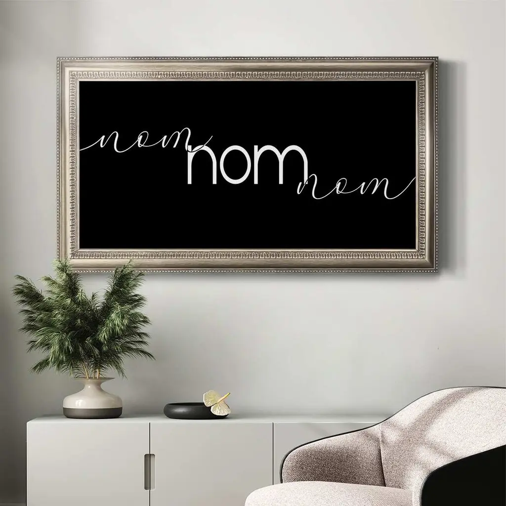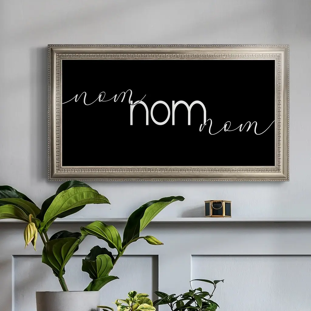 Nom Nom Nom Premium Framed Canvas- Ready to Hang A Premium Framed Canvas created to last. Framed in distressed wood and available in an array of sizes and colors Featuring a beveled a solid wood stretcher bar, each piece comes ready to hand 3 SIZES AVAILABLE 21''X37'' - Overall Size 25''X45'' - Overall Size 29''x53'' - Overall Size Each piece is made to order. Each piece comes with hanging hardware. Made in the USA Ready to Hang Giclee Paper Print Acrylic Glass Beveled Matt Board