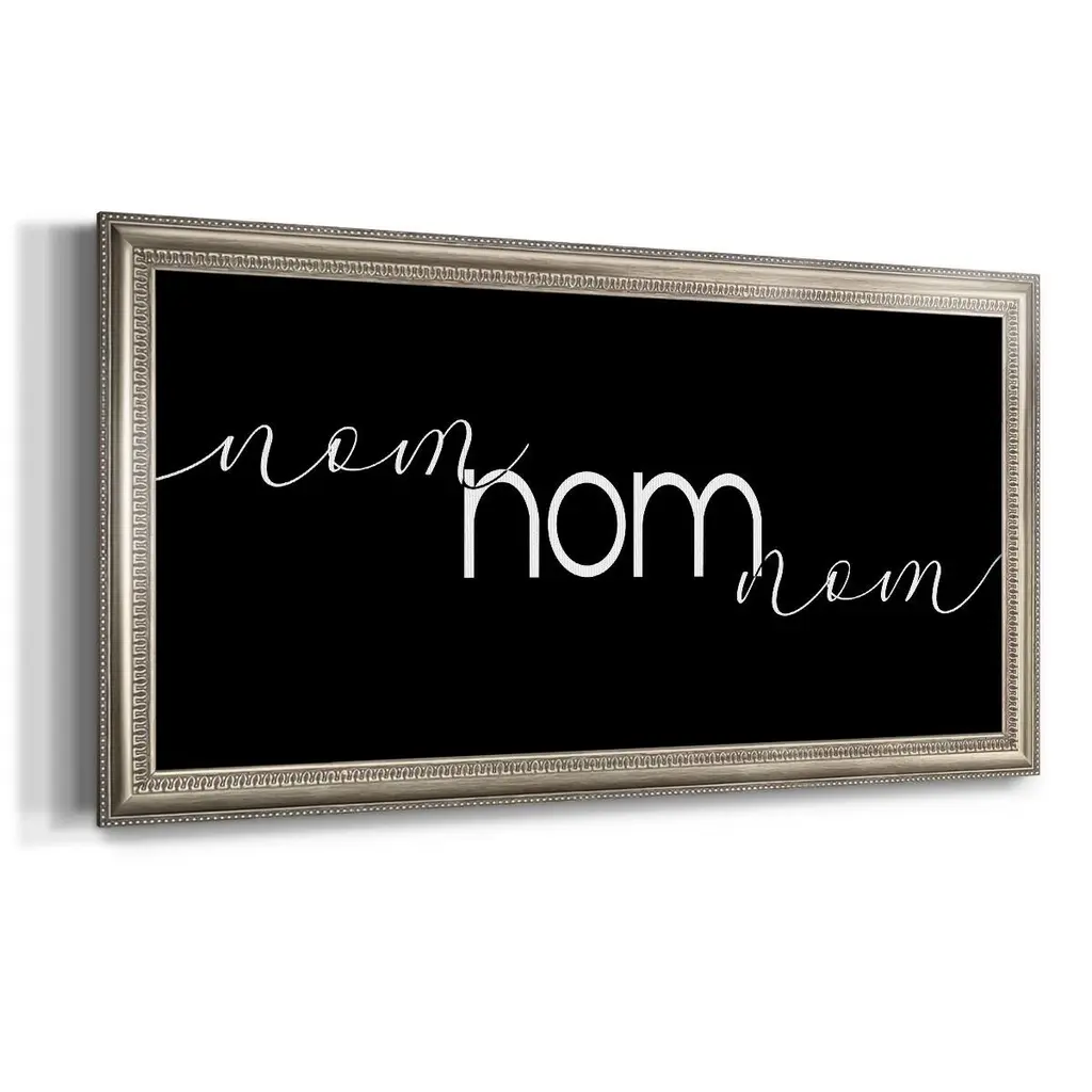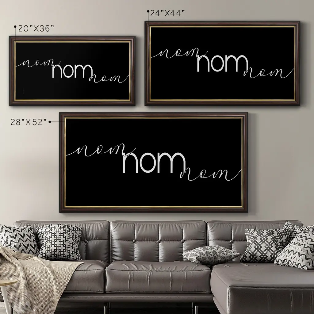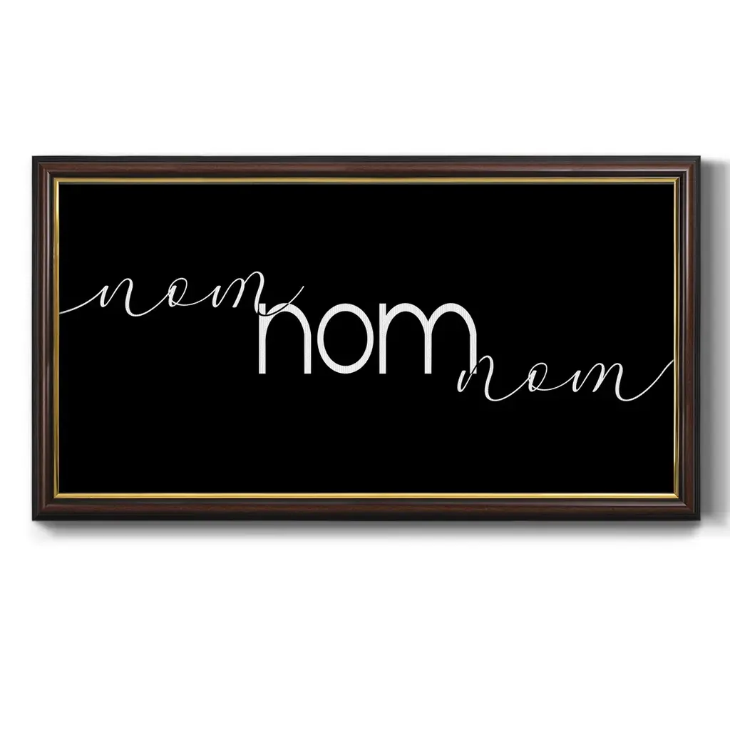 Nom Nom Nom Premium Framed Canvas- Ready to Hang A Premium Framed Canvas created to last. Framed in distressed wood and available in an array of sizes and colors Featuring a beveled a solid wood stretcher bar, each piece comes ready to hand 3 SIZES AVAILABLE 21''X37'' - Overall Size 25''X45'' - Overall Size 29''x53'' - Overall Size Each piece is made to order. Each piece comes with hanging hardware. Made in the USA Ready to Hang Giclee Paper Print Acrylic Glass Beveled Matt Board