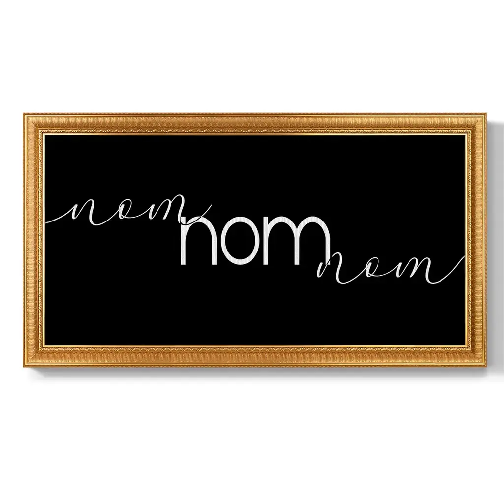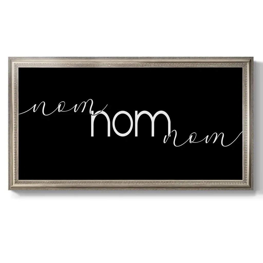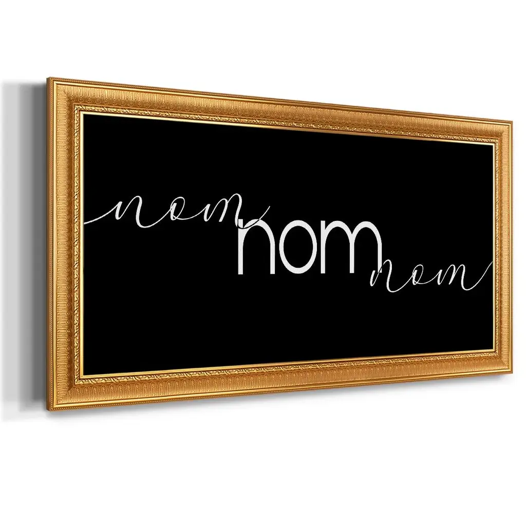 Nom Nom Nom Premium Framed Canvas- Ready to Hang A Premium Framed Canvas created to last. Framed in distressed wood and available in an array of sizes and colors Featuring a beveled a solid wood stretcher bar, each piece comes ready to hand 3 SIZES AVAILABLE 21''X37'' - Overall Size 25''X45'' - Overall Size 29''x53'' - Overall Size Each piece is made to order. Each piece comes with hanging hardware. Made in the USA Ready to Hang Giclee Paper Print Acrylic Glass Beveled Matt Board