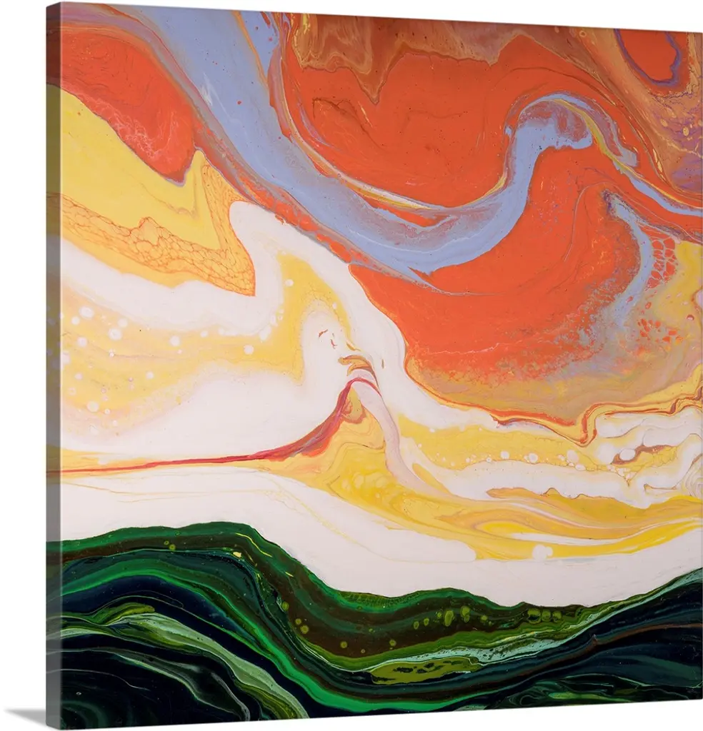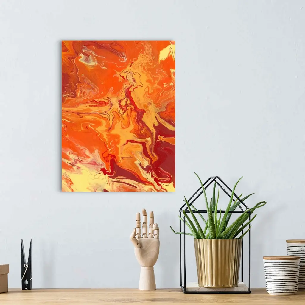 Abstract artwork of yellow, orange and red shades in a liquid marble effect.