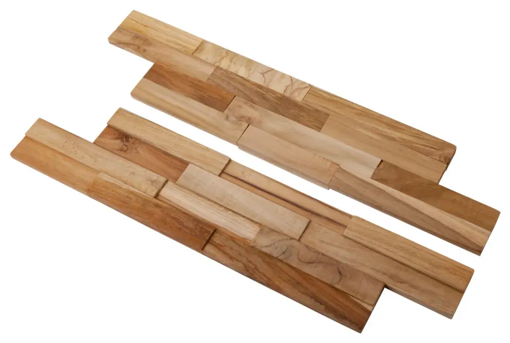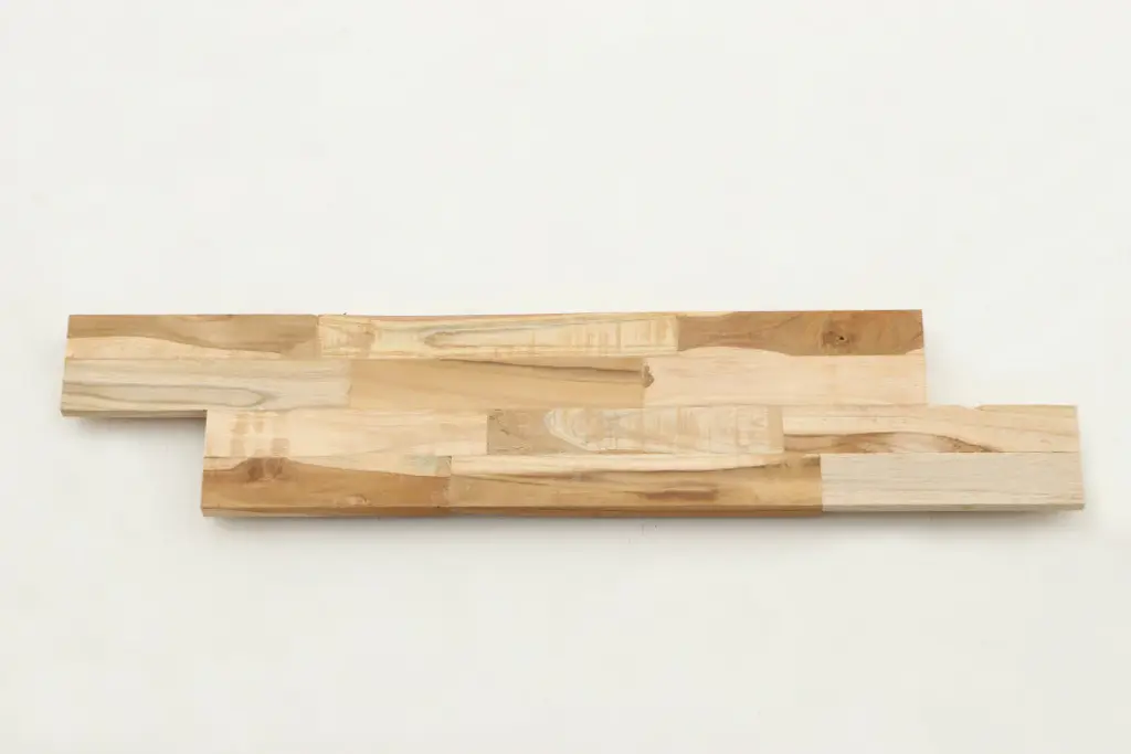 Made from recycled teak wood, our teak wall panels add an eco-friendly and unique look to your existing wall. With a light, natural finish, these panels are sure to brighten up any room. Each box comes with 11 precisely cut pieces that fit together in perfect harmony. Each panel varies in thickness and depth. We recommend wall panels be glued together and that they are professionally installed. There are no tools or mounting hardware included for installation.Each Panel Size: 28"³ x 1.5"³ x 6"³ 1lb (11 Pieces Included per box, roughly 12.75 sq ft.)