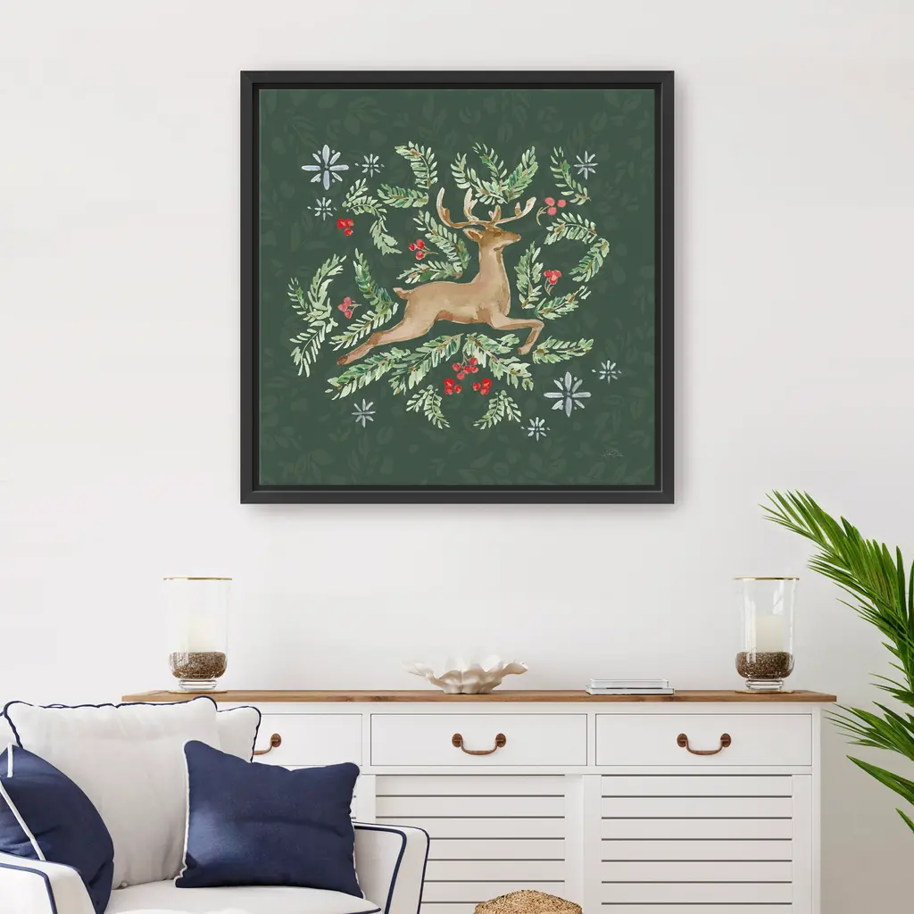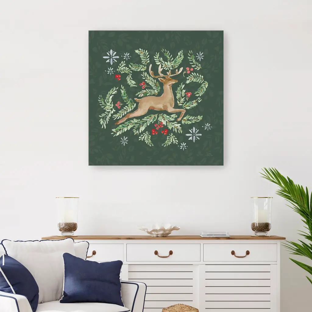 Celebrate the magic of the season with this charming Christmas reindeer canvas print, where whimsy meets winter wonder. With its festive palette and playful elegance, it brings warmth and cheer to any holiday space. Our Gallery Wrap Canvas Prints are proudly assembled with high quality materials in California, USA. Each piece is printed on a thick, archival grade canvas using Giclee technology. It is then hand-stretched by our experienced artisans over solid wood bars, which will not warp over time. The final product is a piece personally crafted for you to confidently display on your wall. Care and Assembly: Ensure that the location of your piece has little to no exposure to heat, sunlight, and moisture. Wipe clean, only if needed. Each piece includes hanging hardware to hang on your wall horizontally.