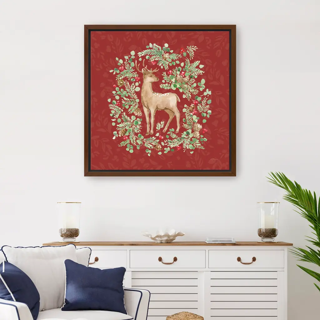 Celebrate the magic of the season with this charming Christmas reindeer canvas print, where whimsy meets winter wonder. With its festive palette and playful elegance, it brings warmth and cheer to any holiday space. Our Gallery Wrap Canvas Prints are proudly assembled with high quality materials in California, USA. Each piece is printed on a thick, archival grade canvas using Giclee technology. It is then hand-stretched by our experienced artisans over solid wood bars, which will not warp over time. The final product is a piece personally crafted for you to confidently display on your wall. Care and Assembly: Ensure that the location of your piece has little to no exposure to heat, sunlight, and moisture. Wipe clean, only if needed. Each piece includes hanging hardware to hang on your wall horizontally.