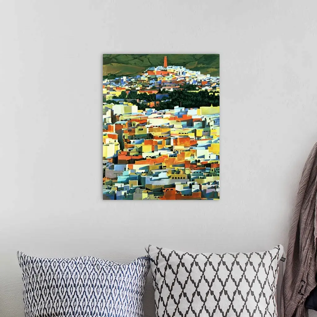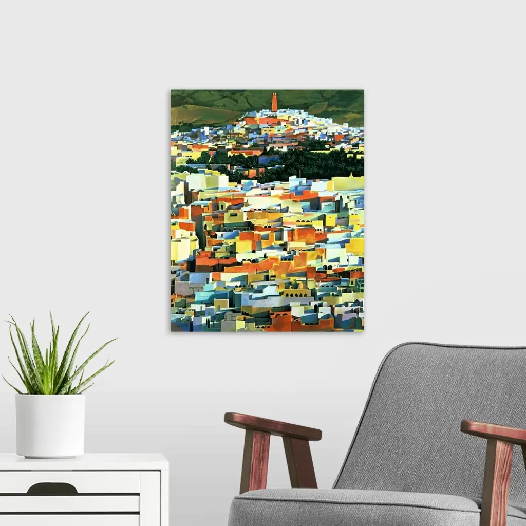 Portrait, oversized contemporary painting of many colorful buildings packed together in a North African Town, green, open fields can be seen in the distant background.