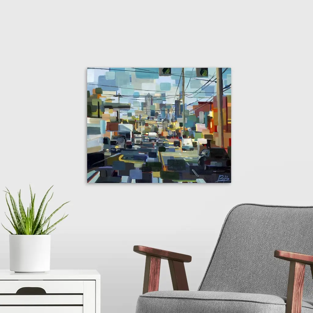 Contemporary abstract painting of an urban environment deconstructed into geometric shapes.