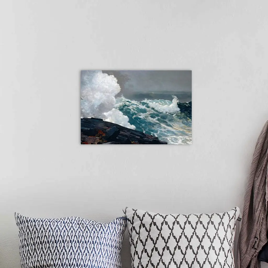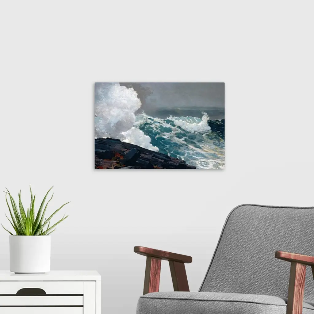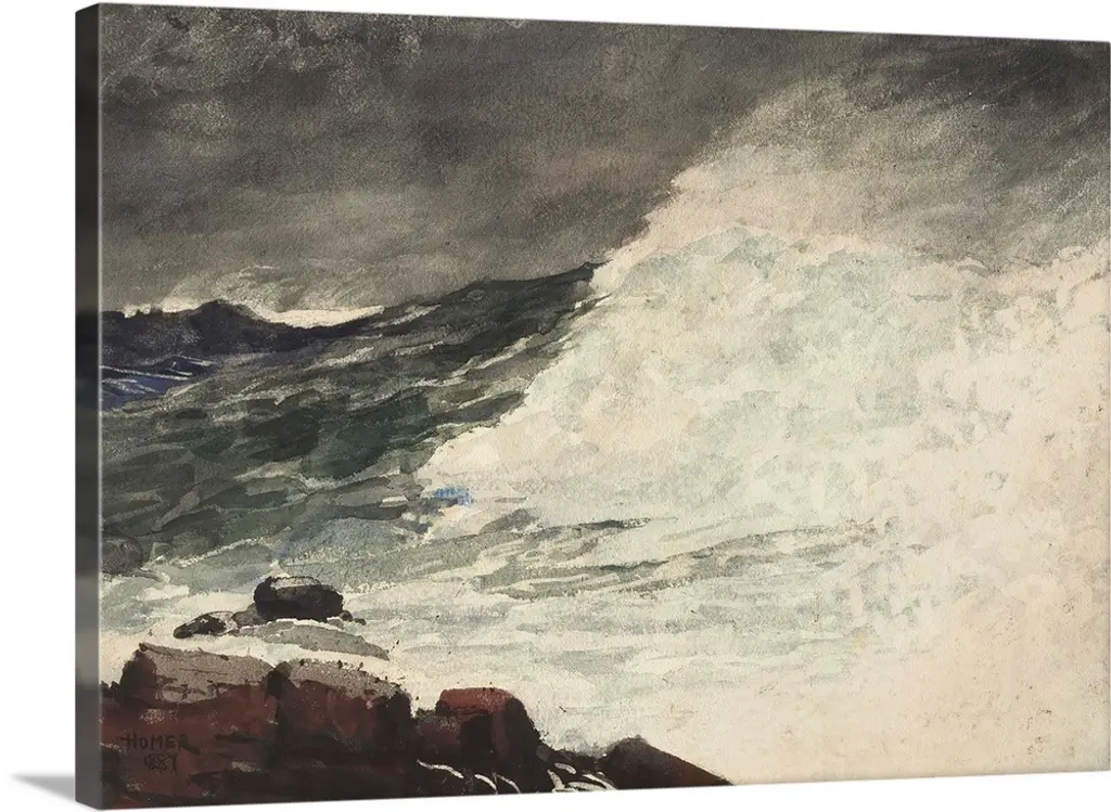 On the Maine coast, a nor'easter is a storm of exceptional violence and duration. When Homer first showed this canvas in 1895, it included two men in foul-weather gear crouching on the rocks below a smaller column of spray. Even though the painting was well received and purchased by a leading collector of American art-George Hearn, who later donated it to the Metropolitan Museum-Homer reworked it to powerful effect.