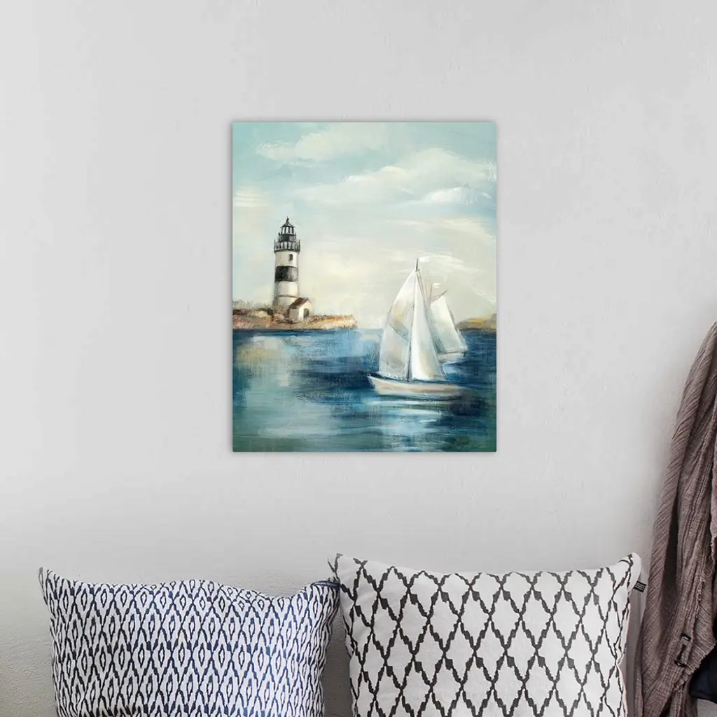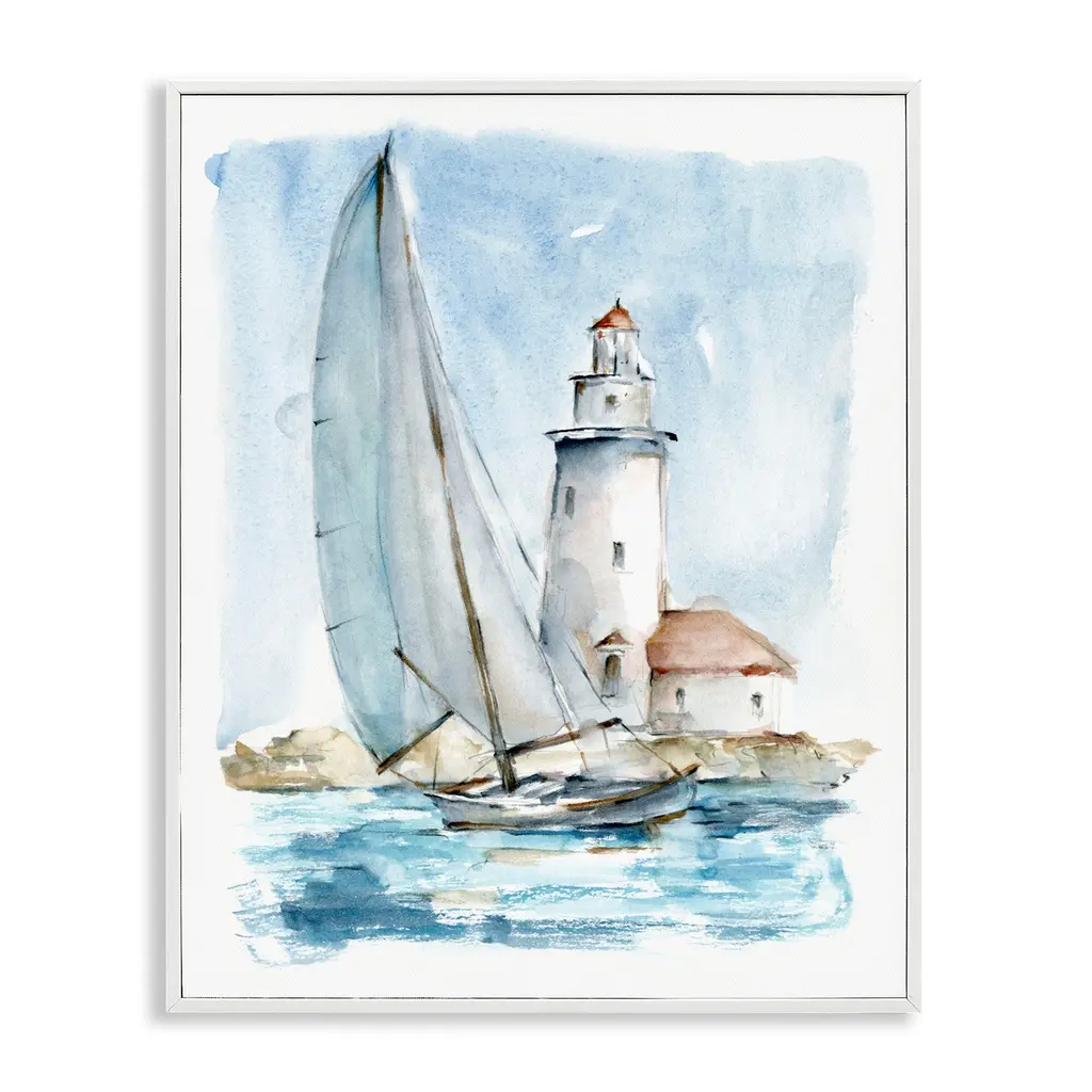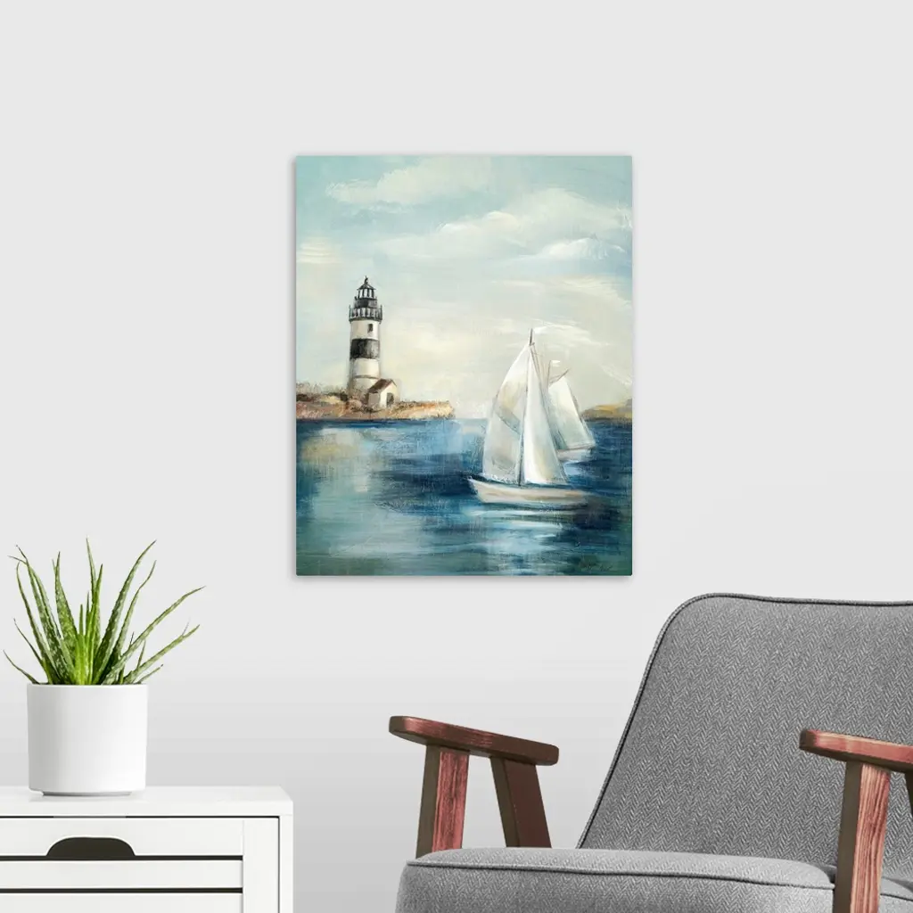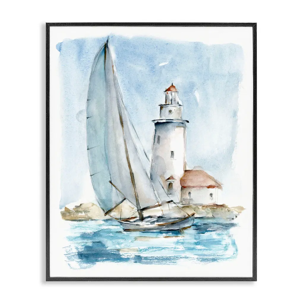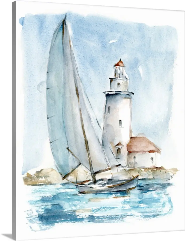 Contemporary painting of an idyllic coastal scene, with a lighthouse in the background and a sailboat in the foreground.