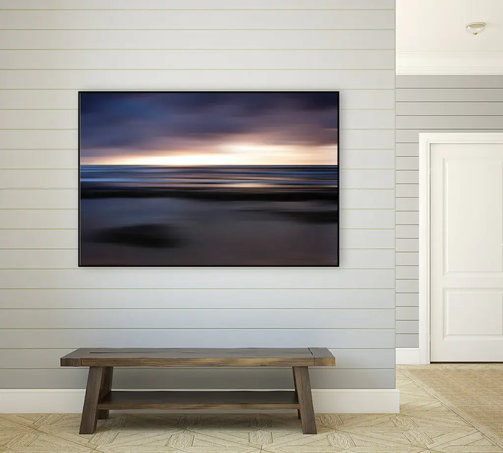 Your ready to hang artwork is printed on canvas then stretched and mounted to a 2-inch thick - hand stained black wood frame. Arrives at your door complete with an easy to use self-leveling hangking kit.
