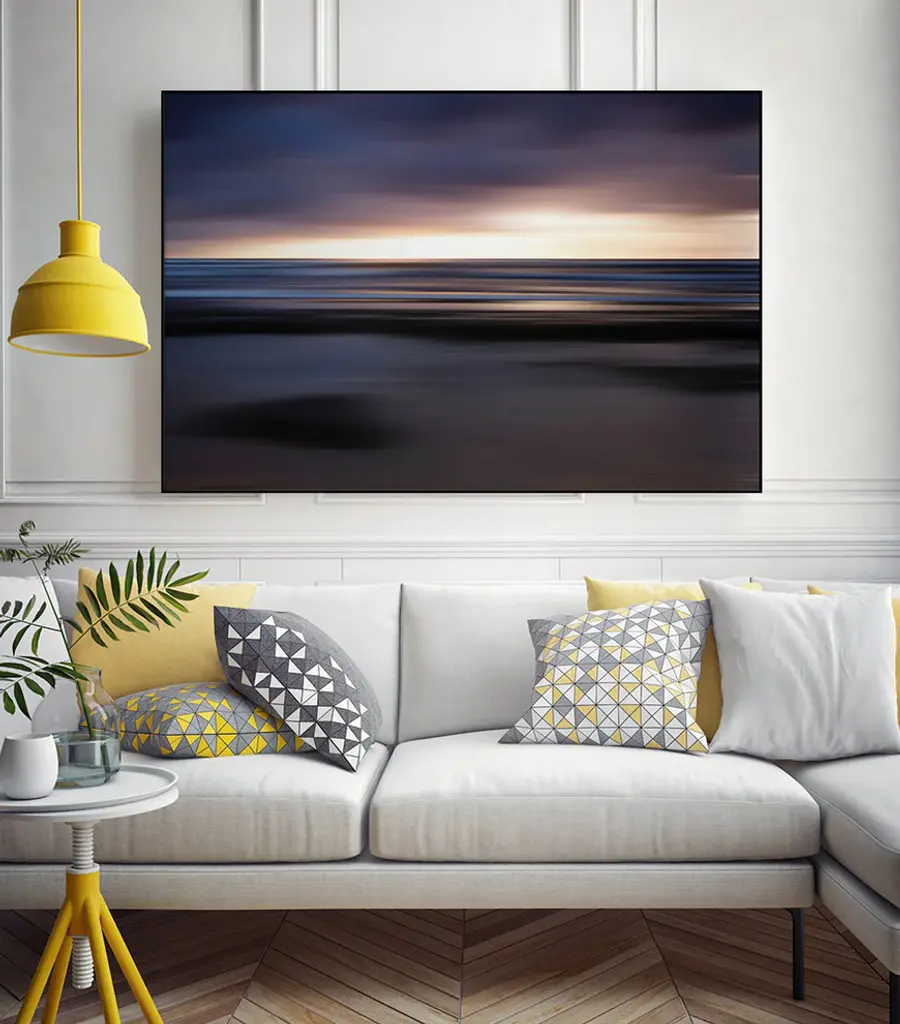 Your ready to hang artwork is printed on canvas then stretched and mounted to a 2-inch thick - hand stained black wood frame. Arrives at your door complete with an easy to use self-leveling hangking kit.