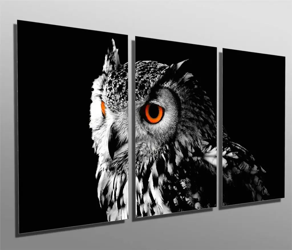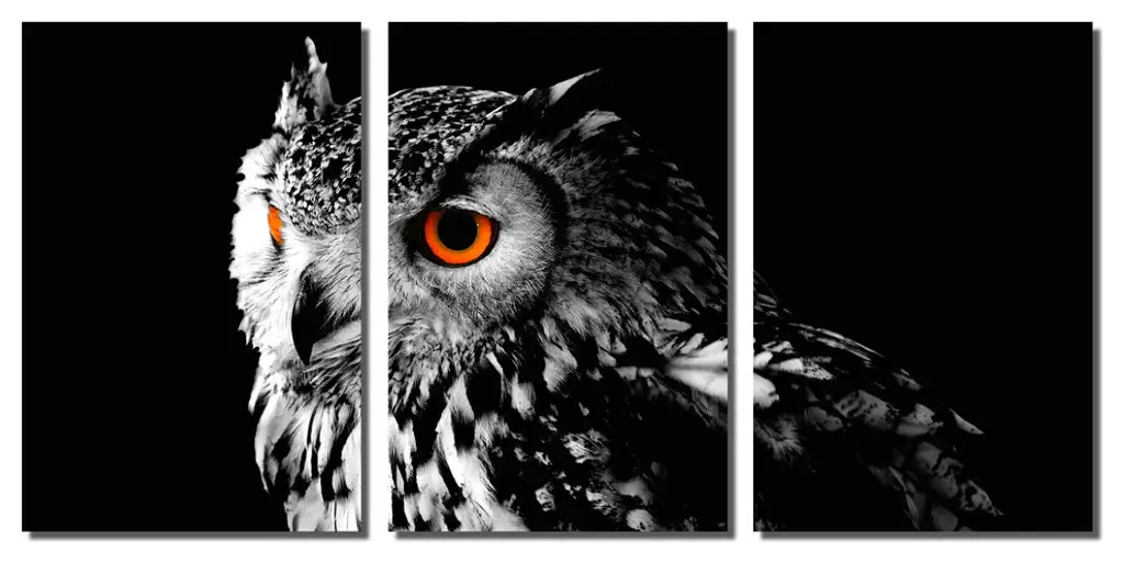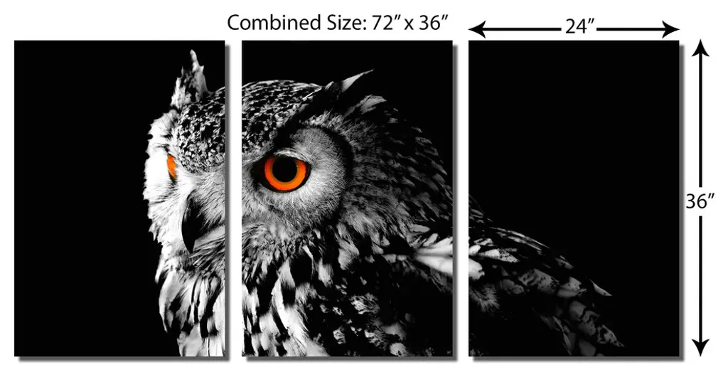 72"œ x 36"œ total size. Ready To Hang! (3 pieces - 24"œ x 36"œ each). 3 Panel Split (Triptych) Northern Pygmy Owl Metal Print. B&W with colored eyes. Modern metal wall art for home or office wall decor & interior design. Printed on Luxurious, HD aluminum glossy metal panels. Multi panel art.. HD aluminum panels. Metal print wall art. Includes Shadow Wall Mount on the back.• Aluminum Metal Wall Art• Made in USA• Ready to hang - No assembly required• Shadow mount hardware on the back• 0.045"œ thick HD Aluminum Panels• Scratch resistant, glossy finish• Superb color clarity, luxurious prints• Epson printing process• For indoor or moisture rich environment use• Easy to clean. Gently wipe with microfiber cloth.