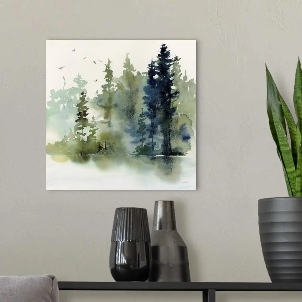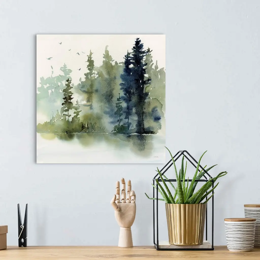 An abstracted contemporary watercolor painting of tall evergreen trees in a misty forest with a lake in the foreground