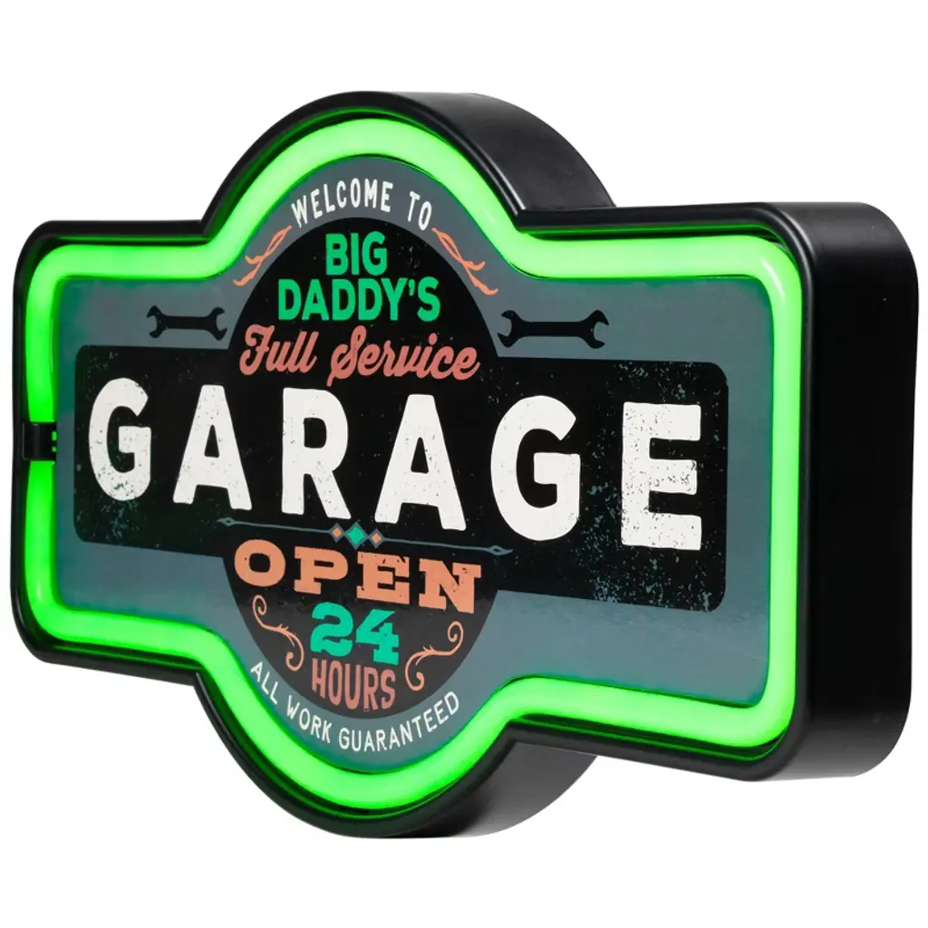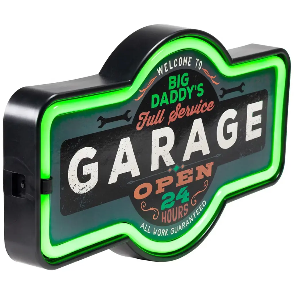 Step back into the golden age of chrome bumpers, leather jackets and roaring engines with this “Big Daddy's Garage” LED neon wall sign. Inspired by classic service stations during the heyday of American car culture, this 17.5”-wide lighted wall art brings serious retro vibes to any garage, man cave or workshop. With its vivid green glow, it blends the look of vintage neon signs with the modern energy-efficiency of LED neon rope light. Whether you're tuning up your ride or just kicking back with a cold one, this battery-operated and USB-compatible sign is the perfect way to rev up your wall decor. Product Features: Color: green rope lights LED type: SMD 2835 One-sided design LED lights use up to 90% less energy Stays cool to the touch UL certified and approved for indoor use Comes ready-to-hang with a keyhole hangers Battery or USB powered Micro USB cord included Requires 4 “AA” size batteries (not included) or USB adaptor (not included) Convenient on/off switch at the side Dimensions: 9.5"H x 17.25"W x 1.75"D Material(s): plastic/silicone