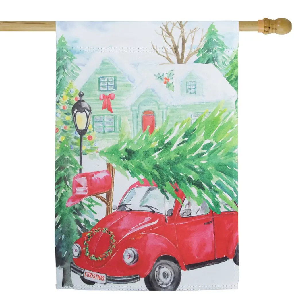 Display your love of the holiday season with this flag! Reminiscent of a watercolor painting of picking up a fresh-cut holiday tree, this flag makes a splendid addition to your outdoor winter decor! Merry holiday to all and enjoy the season! Features: Outdoor holiday garden flag Small red bug car carrying a fresh-cut holiday tree Looks like a watercolor painting Winter scene with a green house in the background Red mailbox filled with letters Decorated pine tree in the lawn House has mistletoe and big red bow Features a soft, high-quality fabric for durability Sleeve on top allows the flag to slide onto the flagpole Design is on both sides Care instructions: Hand wash in cold water with mild soap. Hang dry. Use cool iron if needed Dimensions: 40" long x 28" wide Material(s): polyester Note: Flagpole is not included
