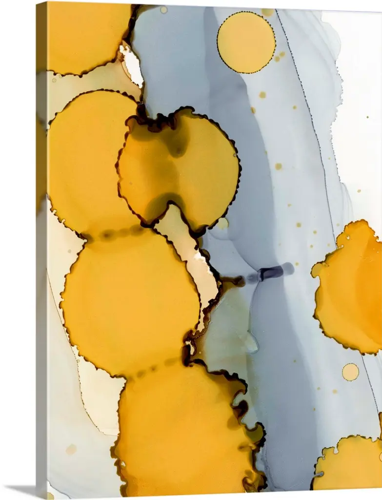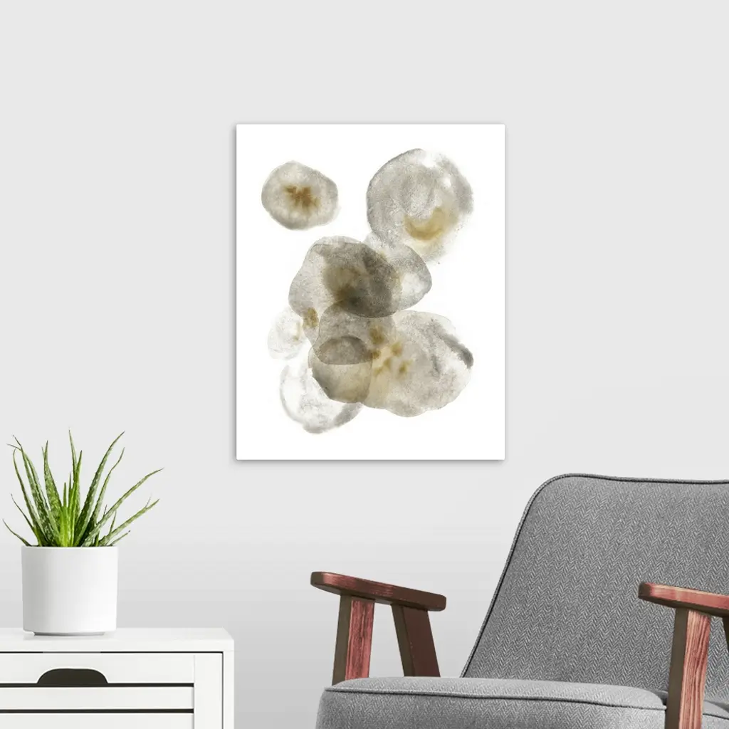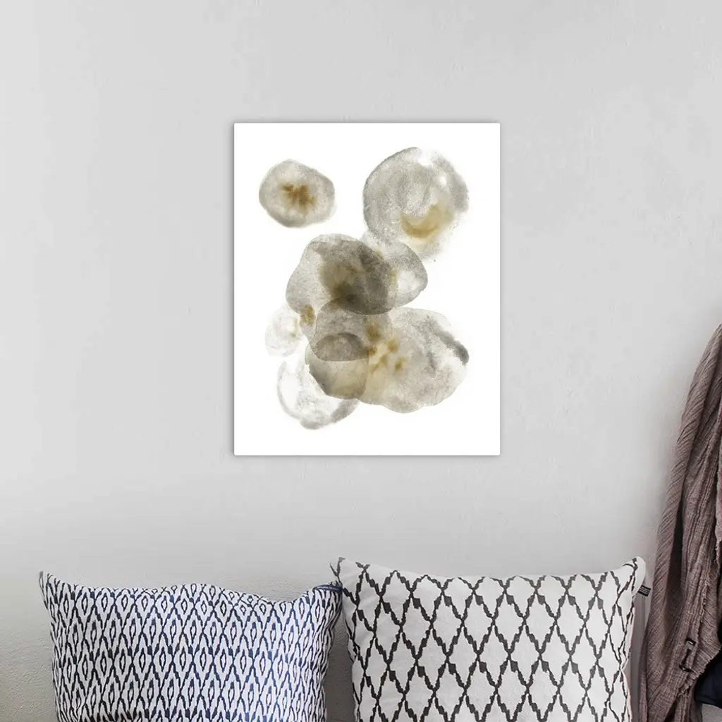 This abstract artwork features puddles of transparent gray color mottled with brown over a white background to illustrate the mixed feelings one gets when recalling something from the past.