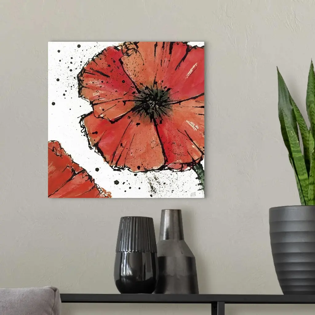 Artwork of a large red flower speckled with black paint from the center and jetting out.