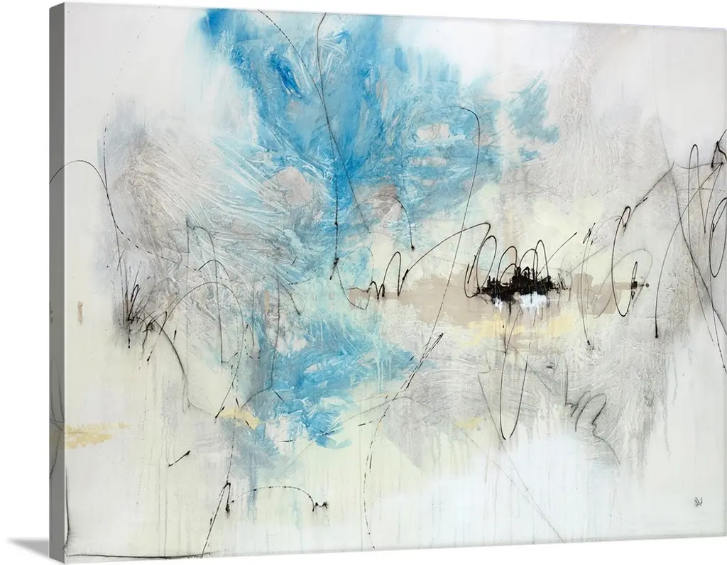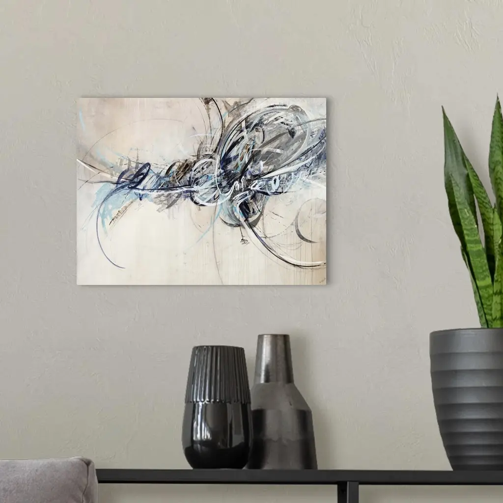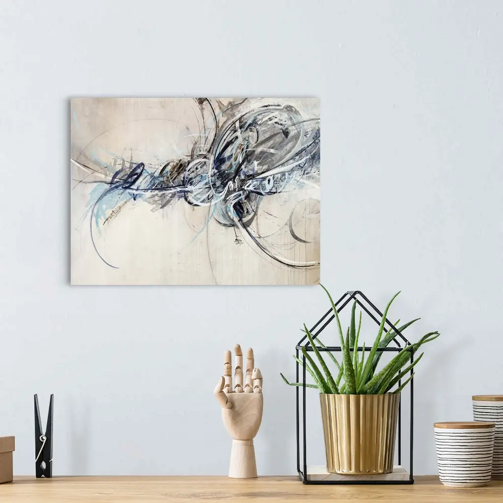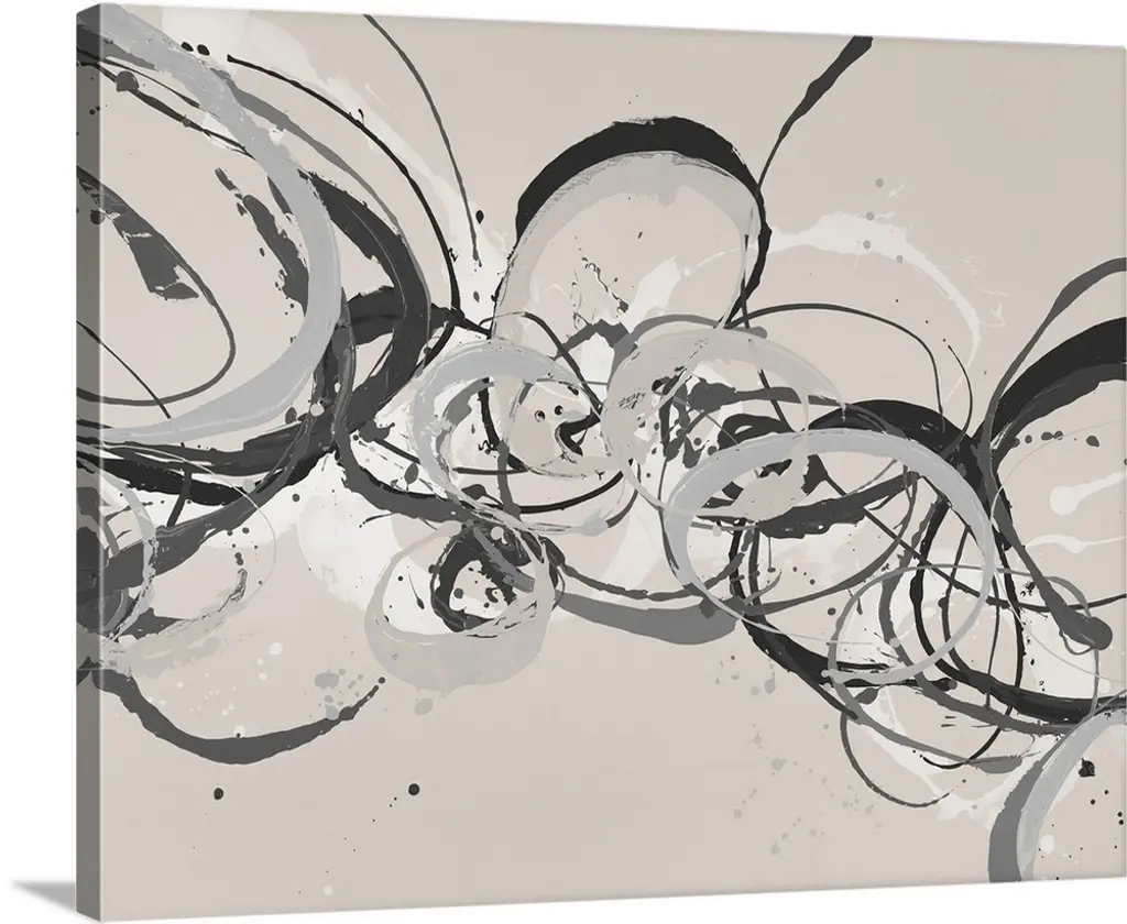 Contemporary abstract painting in quick brush strokes in black and white, showing movement.