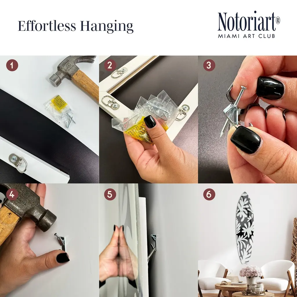 Elevate your home decor with NOTORIART's bold and exclusive Acrylic Glass Surfboard Wall Art. Handcrafted in Miami and made-to-order, this decorative surfboard is more than just coastal decor—it's a statement piece designed to reflect your unique style. Made from high-quality die-cut acrylic glass, it boasts a vibrant, high-gloss finish that brings depth, movement, and life to any space. Whether you're looking to capture the essence of coastal living or seeking a modern art piece to enhance your room, this surfboard offers versatile display options, hanging both horizontally and vertically. Each piece is carefully crafted with a wooden frame for easy installation and long-lasting durability. Bring the essence of Miami's artistic flair into your home with a decor item that blends sophistication, authenticity, and individuality.Features: Interior Designers Note: Crafted from die-cut acrylic glass, this decorative surfboard brings bold, vibrant energy to any space. Its hand-polished, glass-like finish creates depth and movement, making it a standout piece in modern decor.Versatile Display Options: This statement piece can be hung both horizontally and vertically. Pre-installed with a wooden frame, hanging hardware, and nails included, it arrives ready to hang. Size per panel: 15"x 60"Handcrafted Excellence: Each piece is meticulously made to order in Miami, reflecting the unique style and quality of NOTORIART's designs. Our skilled artisans ensure attention to detail, producing a luxurious, standout decor item.Premium Materials & Secure Packaging: Constructed from high-quality die-cut acrylic glass with a vibrant, high-gloss finish, this surfboard arrives securely packaged to ensure it reaches you in pristine condition. The wooden frame provides durability and long-lasting beauty.Exclusive Statement Piece: Inspired by Miami's vibrant art scene, this decorative surfboard merges modern design with coastal influences. Ideal for any room, it brings a touch of refined elegance and individuality to your home or office.Wipe clean with a soft, dry microfiber cloth. Avoid using water or cleaning sprays to maintain the high-gloss finish. Not suitable for outdoor use.
