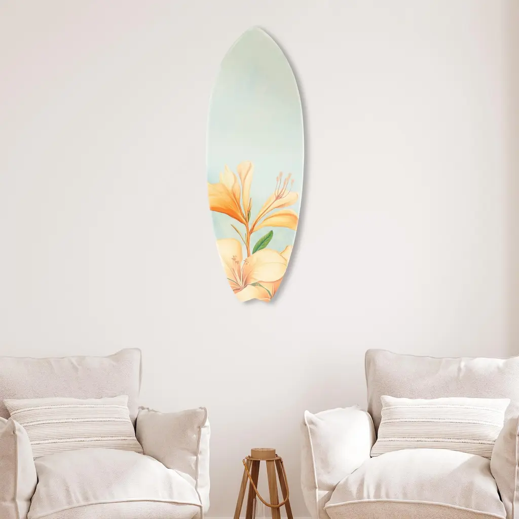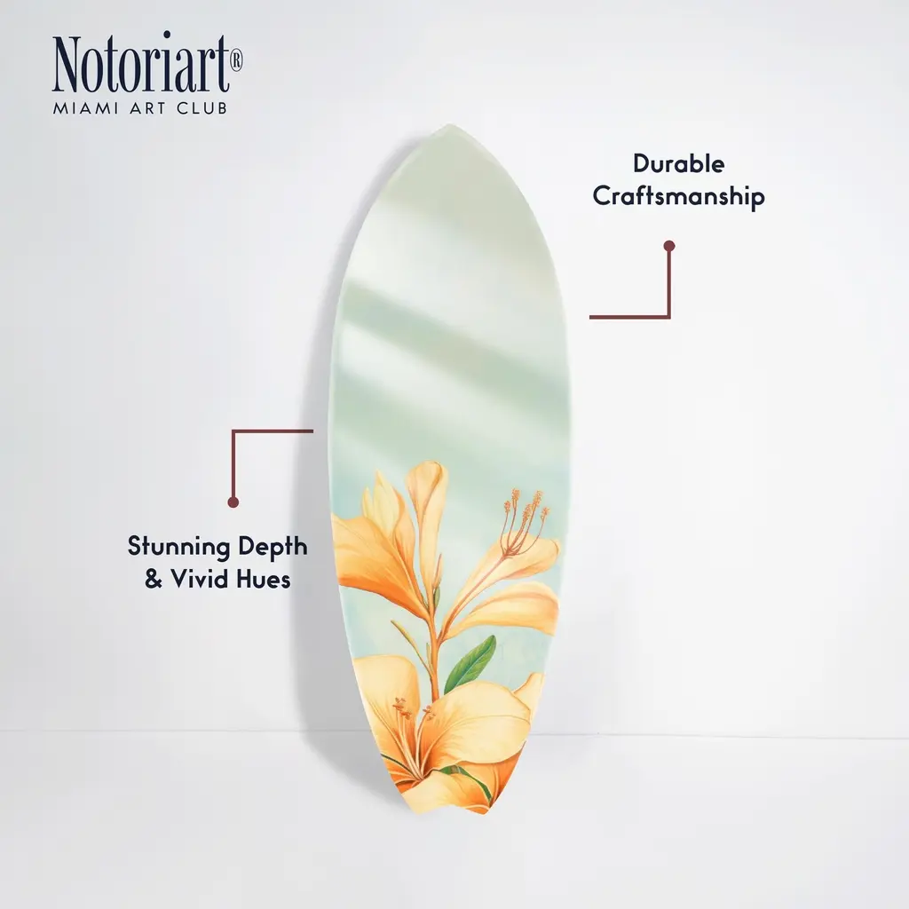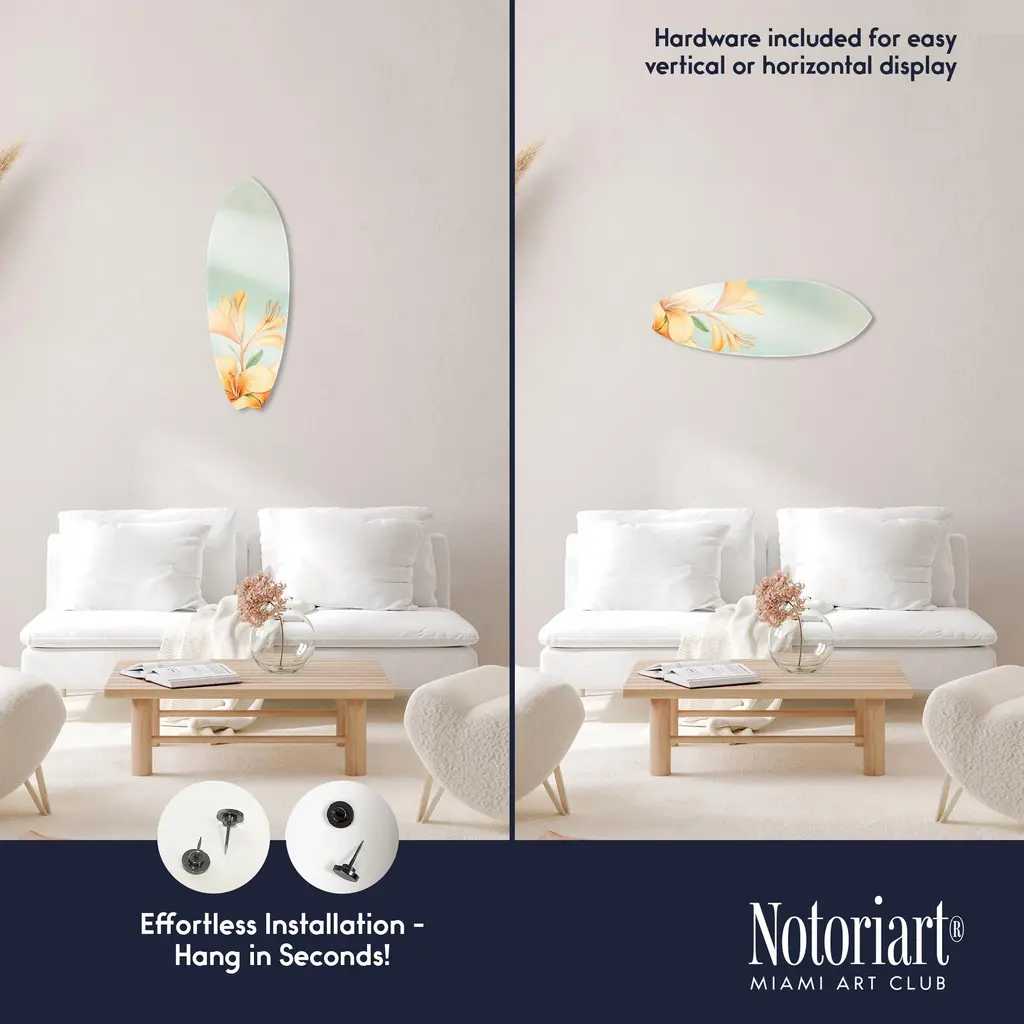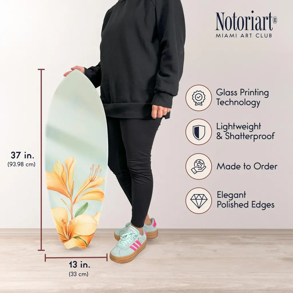 Elevate your home decor with NOTORIART's bold and exclusive Acrylic Glass Skimboard Wall Art. Handcrafted in Miami and made-to-order, this decorative skimboard is more than just coastal decor—it's a statement piece designed to reflect your unique style. Made from high-quality die-cut acrylic glass, it boasts a vibrant, high-gloss finish that brings depth, movement, and life to any space. Whether you're looking to capture the essence of coastal living or seeking a modern art piece to enhance your room, this skimboard offers versatile display options, hanging both horizontally and vertically. Featuring just 2 small holes, it comes with 4 durable aluminum thumbtacks (2 black, 2 silver) for effortless hanging—no complicated tools required. Bring the essence of Miami's artistic flair into your home with a decor item that blends sophistication, authenticity, and individuality.Features: Interior Designers Note: Crafted from die-cut acrylic glass, this decorative skimboard brings bold, vibrant energy to any space. Its hand-polished, glass-like finish creates depth and movement, making it a standout piece in modern decor.Simple, Sleek Hanging Solution: With just 2 small holes and 4 sturdy aluminum thumbtacks provided (2 black, 2 silver), hanging this art is effortless. Push the thumbtacks into the wall—no tools or measuring needed.Handcrafted Excellence: Each piece is meticulously made to order in Miami, reflecting the unique style and quality of NOTORIART's designs. Our skilled artisans ensure attention to detail, producing a luxurious, standout decor item.Premium Materials & Secure Packaging: Constructed from high-quality die-cut acrylic glass with a vibrant, high-gloss finish, this skimboard arrives securely packaged to ensure it reaches you in pristine condition. Exclusive Statement Piece: Inspired by Miami's vibrant art scene, this decorative skimboard merges modern design with coastal influences. Ideal for any room, it brings a touch of refined elegance and individuality to your home or office.Wipe clean with a soft, dry microfiber cloth. Avoid using water or cleaning sprays to maintain the high-gloss finish. Not suitable for outdoor use.