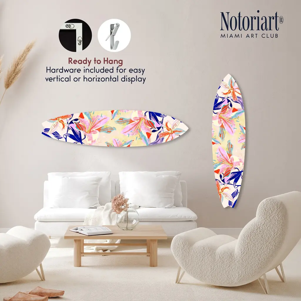 Elevate your home decor with NOTORIART's bold and exclusive Acrylic Glass Surfboard Wall Art. Handcrafted in Miami and made-to-order, this decorative surfboard is more than just coastal decor—it's a statement piece designed to reflect your unique style. Made from high-quality die-cut acrylic glass, it boasts a vibrant, high-gloss finish that brings depth, movement, and life to any space. Whether you're looking to capture the essence of coastal living or seeking a modern art piece to enhance your room, this surfboard offers versatile display options, hanging both horizontally and vertically. Each piece is carefully crafted with a wooden frame for easy installation and long-lasting durability. Bring the essence of Miami's artistic flair into your home with a decor item that blends sophistication, authenticity, and individuality.Features: Interior Designers Note: Crafted from die-cut acrylic glass, this decorative surfboard brings bold, vibrant energy to any space. Its hand-polished, glass-like finish creates depth and movement, making it a standout piece in modern decor.Versatile Display Options: This statement piece can be hung both horizontally and vertically. Pre-installed with a wooden frame, hanging hardware, and nails included, it arrives ready to hang. Size per panel: 15"x 60"Handcrafted Excellence: Each piece is meticulously made to order in Miami, reflecting the unique style and quality of NOTORIART's designs. Our skilled artisans ensure attention to detail, producing a luxurious, standout decor item.Premium Materials & Secure Packaging: Constructed from high-quality die-cut acrylic glass with a vibrant, high-gloss finish, this surfboard arrives securely packaged to ensure it reaches you in pristine condition. The wooden frame provides durability and long-lasting beauty.Exclusive Statement Piece: Inspired by Miami's vibrant art scene, this decorative surfboard merges modern design with coastal influences. Ideal for any room, it brings a touch of refined elegance and individuality to your home or office.Wipe clean with a soft, dry microfiber cloth. Avoid using water or cleaning sprays to maintain the high-gloss finish. Not suitable for outdoor use.