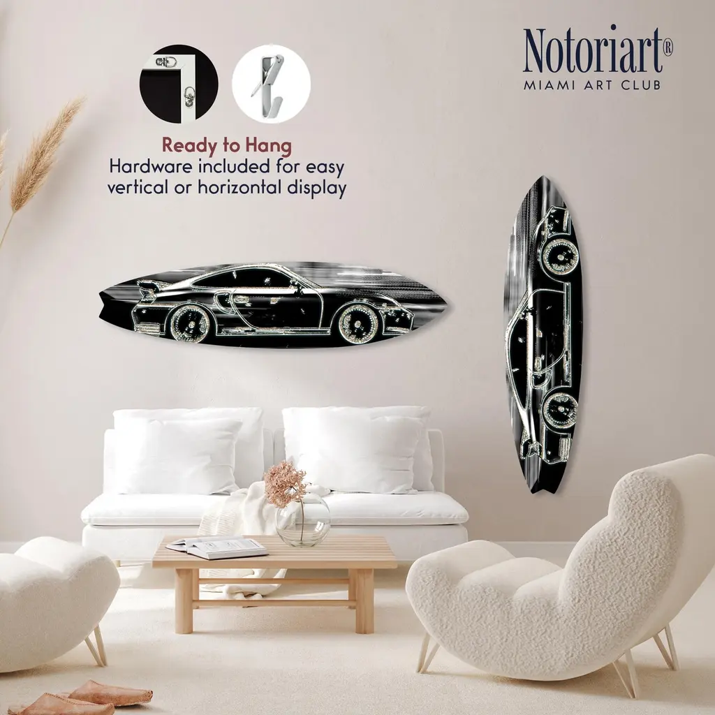 Elevate your home decor with NOTORIART's bold and exclusive Acrylic Glass Surfboard Wall Art. Handcrafted in Miami and made-to-order, this decorative surfboard is more than just coastal decor—it's a statement piece designed to reflect your unique style. Made from high-quality die-cut acrylic glass, it boasts a vibrant, high-gloss finish that brings depth, movement, and life to any space. Whether you're looking to capture the essence of coastal living or seeking a modern art piece to enhance your room, this surfboard offers versatile display options, hanging both horizontally and vertically. Each piece is carefully crafted with a wooden frame for easy installation and long-lasting durability. Bring the essence of Miami's artistic flair into your home with a decor item that blends sophistication, authenticity, and individuality.Features: Interior Designers Note: Crafted from die-cut acrylic glass, this decorative surfboard brings bold, vibrant energy to any space. Its hand-polished, glass-like finish creates depth and movement, making it a standout piece in modern decor.Versatile Display Options: This statement piece can be hung both horizontally and vertically. Pre-installed with a wooden frame, hanging hardware, and nails included, it arrives ready to hang. Size per panel: 15"x 60"Handcrafted Excellence: Each piece is meticulously made to order in Miami, reflecting the unique style and quality of NOTORIART's designs. Our skilled artisans ensure attention to detail, producing a luxurious, standout decor item.Premium Materials & Secure Packaging: Constructed from high-quality die-cut acrylic glass with a vibrant, high-gloss finish, this surfboard arrives securely packaged to ensure it reaches you in pristine condition. The wooden frame provides durability and long-lasting beauty.Exclusive Statement Piece: Inspired by Miami's vibrant art scene, this decorative surfboard merges modern design with coastal influences. Ideal for any room, it brings a touch of refined elegance and individuality to your home or office.Wipe clean with a soft, dry microfiber cloth. Avoid using water or cleaning sprays to maintain the high-gloss finish. Not suitable for outdoor use.