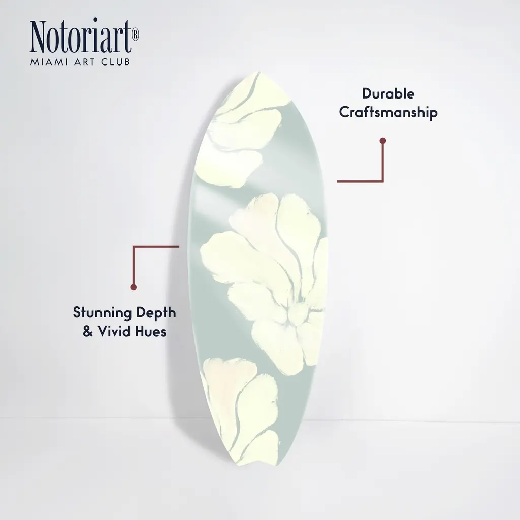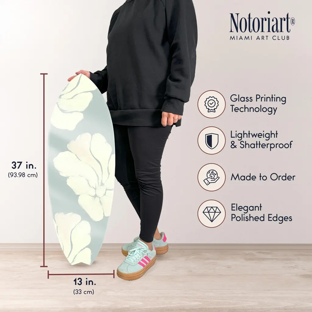 Elevate your home decor with NOTORIART's bold and exclusive Acrylic Glass Skimboard Wall Art. Handcrafted in Miami and made-to-order, this decorative skimboard is more than just coastal decor—it's a statement piece designed to reflect your unique style. Made from high-quality die-cut acrylic glass, it boasts a vibrant, high-gloss finish that brings depth, movement, and life to any space. Whether you're looking to capture the essence of coastal living or seeking a modern art piece to enhance your room, this skimboard offers versatile display options, hanging both horizontally and vertically. Featuring just 2 small holes, it comes with 4 durable aluminum thumbtacks (2 black, 2 silver) for effortless hanging—no complicated tools required. Bring the essence of Miami's artistic flair into your home with a decor item that blends sophistication, authenticity, and individuality.Features: Interior Designers Note: Crafted from die-cut acrylic glass, this decorative skimboard brings bold, vibrant energy to any space. Its hand-polished, glass-like finish creates depth and movement, making it a standout piece in modern decor.Simple, Sleek Hanging Solution: With just 2 small holes and 4 sturdy aluminum thumbtacks provided (2 black, 2 silver), hanging this art is effortless. Push the thumbtacks into the wall—no tools or measuring needed.Handcrafted Excellence: Each piece is meticulously made to order in Miami, reflecting the unique style and quality of NOTORIART's designs. Our skilled artisans ensure attention to detail, producing a luxurious, standout decor item.Premium Materials & Secure Packaging: Constructed from high-quality die-cut acrylic glass with a vibrant, high-gloss finish, this skimboard arrives securely packaged to ensure it reaches you in pristine condition. Exclusive Statement Piece: Inspired by Miami's vibrant art scene, this decorative skimboard merges modern design with coastal influences. Ideal for any room, it brings a touch of refined elegance and individuality to your home or office.Wipe clean with a soft, dry microfiber cloth. Avoid using water or cleaning sprays to maintain the high-gloss finish. Not suitable for outdoor use.