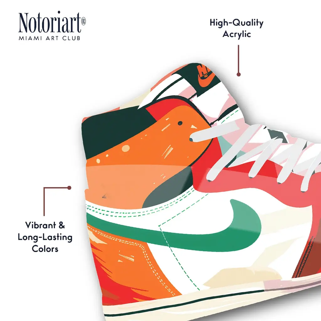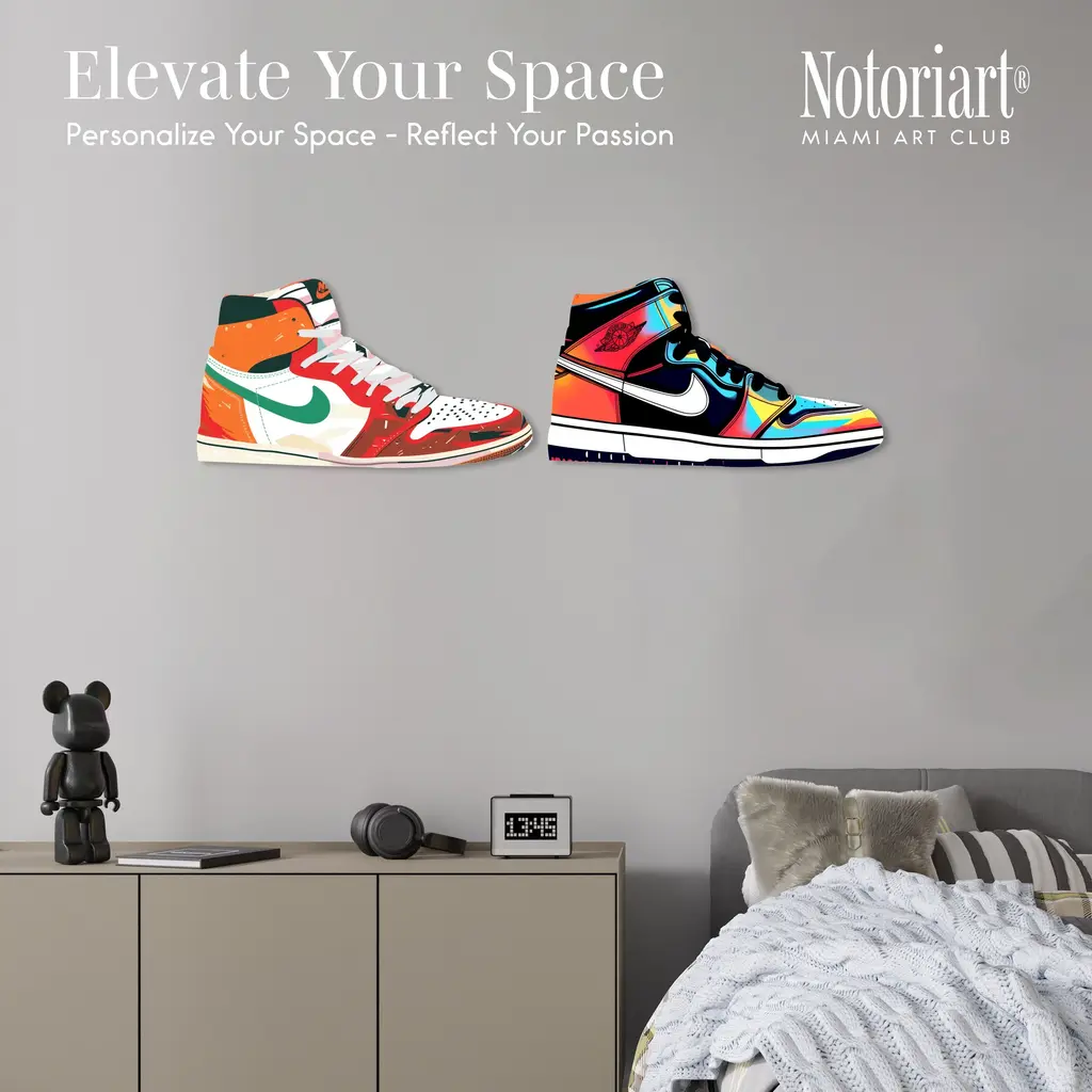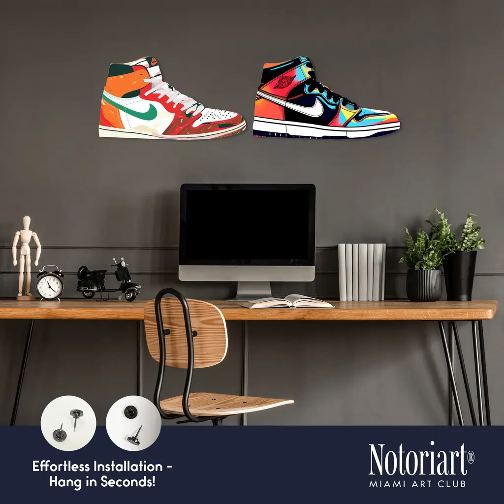 Discover the ultimate fusion of sneaker culture, street art, and high-end decor with NOTORIART's Acrylic Glass Sneaker Wall Art. This 19" x 10.5" masterpiece blends iconic sneaker designs with vibrant graffiti and hand-polished details. With just 2 small holes, this collectible piece includes 4 durable aluminum thumbtacks (2 black, 2 silver) for easy hanging—no complex tools needed. Ideal for sneakerheads and modern art collectors, this exclusive design is handmade to order in Miami, making it a bold statement piece for any space.Features: Interior Designer's Note: This collectible sneaker-shaped wall decor is crafted from precision-cut acrylic glass, showcasing vibrant graffiti elements and bold colors for a standout piece that energizes any room.Simple, Sleek Hanging Solution: With just 2 small holes and 4 sturdy aluminum thumbtacks provided (2 black, 2 silver), hanging this art is effortless. Push the thumbtacks into the wall—no drills or measuring required.Graffiti-Inspired Street Style: This high-quality, hand-polished acrylic glass art captures the raw energy of urban culture, making it a bold expression of modern street style and pop art.Premium Materials & Secure Packaging: Featuring a glossy, vibrant finish, each piece is securely packaged to ensure it arrives in flawless, collectible condition.Exclusive NOTORIART Collectible: Handcrafted in Miami, this limited-edition wall art is perfect for sneaker lovers and urban culture enthusiasts, serving as a unique expression of individuality.To preserve its high-gloss finish, clean with a soft, dry microfiber cloth. Avoid using water or sprays. Suitable for indoor use only.