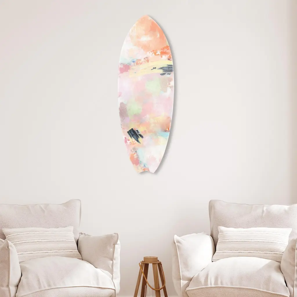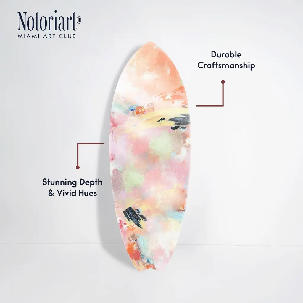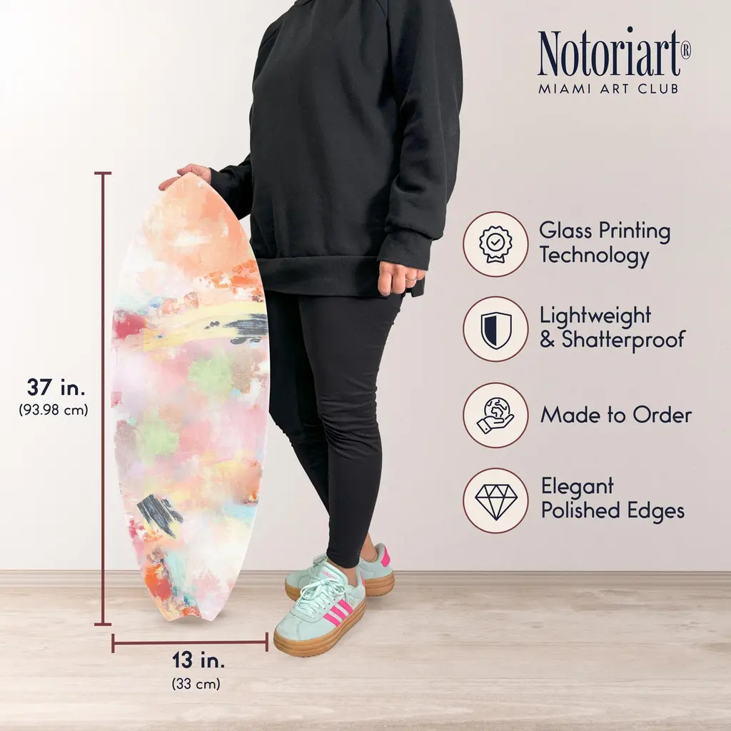 Elevate your home decor with NOTORIART's bold and exclusive Acrylic Glass Skimboard Wall Art. Handcrafted in Miami and made-to-order, this decorative skimboard is more than just coastal decor—it's a statement piece designed to reflect your unique style. Made from high-quality die-cut acrylic glass, it boasts a vibrant, high-gloss finish that brings depth, movement, and life to any space. Whether you're looking to capture the essence of coastal living or seeking a modern art piece to enhance your room, this skimboard offers versatile display options, hanging both horizontally and vertically. Featuring just 2 small holes, it comes with 4 durable aluminum thumbtacks (2 black, 2 silver) for effortless hanging—no complicated tools required. Bring the essence of Miami's artistic flair into your home with a decor item that blends sophistication, authenticity, and individuality.Features: Interior Designers Note: Crafted from die-cut acrylic glass, this decorative skimboard brings bold, vibrant energy to any space. Its hand-polished, glass-like finish creates depth and movement, making it a standout piece in modern decor.Simple, Sleek Hanging Solution: With just 2 small holes and 4 sturdy aluminum thumbtacks provided (2 black, 2 silver), hanging this art is effortless. Push the thumbtacks into the wall—no tools or measuring needed.Handcrafted Excellence: Each piece is meticulously made to order in Miami, reflecting the unique style and quality of NOTORIART's designs. Our skilled artisans ensure attention to detail, producing a luxurious, standout decor item.Premium Materials & Secure Packaging: Constructed from high-quality die-cut acrylic glass with a vibrant, high-gloss finish, this skimboard arrives securely packaged to ensure it reaches you in pristine condition. Exclusive Statement Piece: Inspired by Miami's vibrant art scene, this decorative skimboard merges modern design with coastal influences. Ideal for any room, it brings a touch of refined elegance and individuality to your home or office.Wipe clean with a soft, dry microfiber cloth. Avoid using water or cleaning sprays to maintain the high-gloss finish. Not suitable for outdoor use.