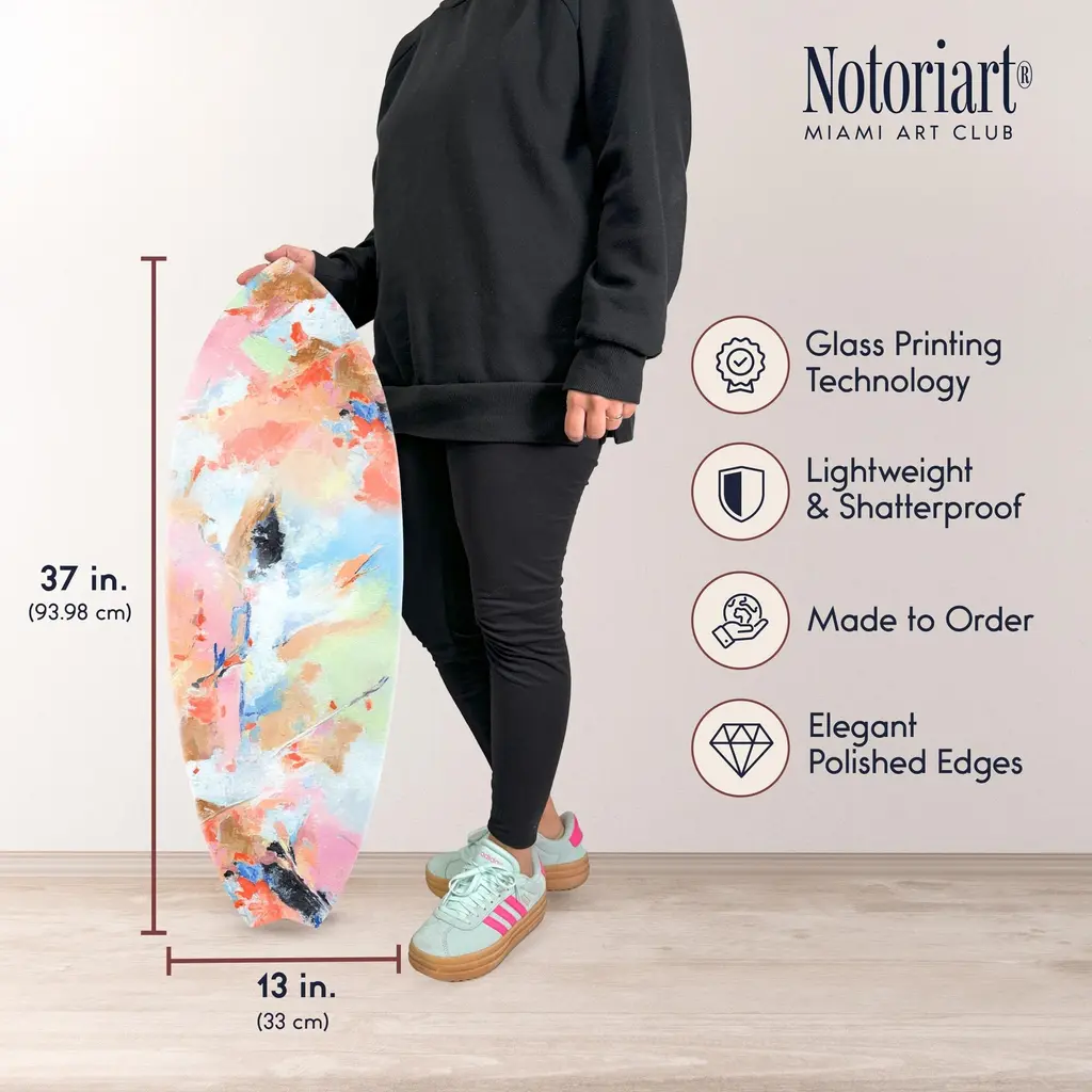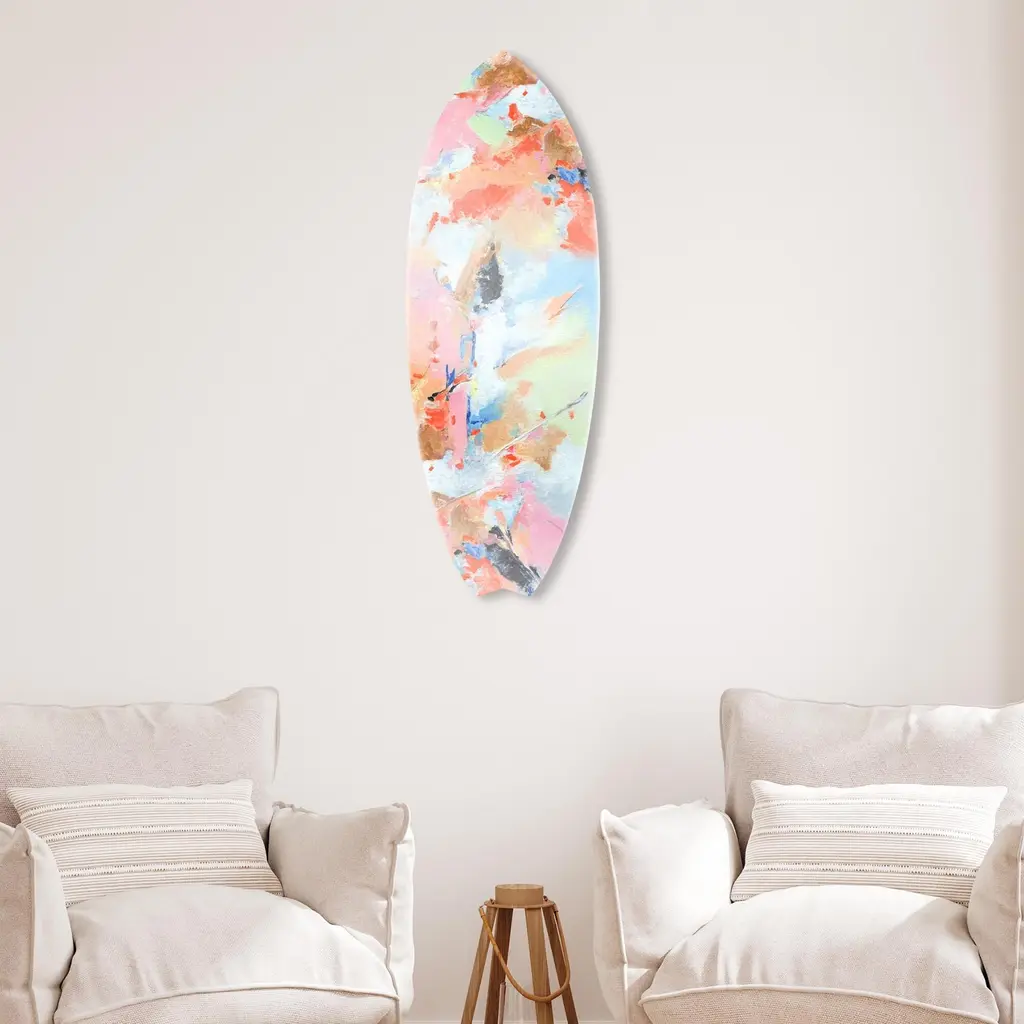 Elevate your home decor with NOTORIART's bold and exclusive Acrylic Glass Skimboard Wall Art. Handcrafted in Miami and made-to-order, this decorative skimboard is more than just coastal decor—it's a statement piece designed to reflect your unique style. Made from high-quality die-cut acrylic glass, it boasts a vibrant, high-gloss finish that brings depth, movement, and life to any space. Whether you're looking to capture the essence of coastal living or seeking a modern art piece to enhance your room, this skimboard offers versatile display options, hanging both horizontally and vertically. Featuring just 2 small holes, it comes with 4 durable aluminum thumbtacks (2 black, 2 silver) for effortless hanging—no complicated tools required. Bring the essence of Miami's artistic flair into your home with a decor item that blends sophistication, authenticity, and individuality.Features: Interior Designers Note: Crafted from die-cut acrylic glass, this decorative skimboard brings bold, vibrant energy to any space. Its hand-polished, glass-like finish creates depth and movement, making it a standout piece in modern decor.Simple, Sleek Hanging Solution: With just 2 small holes and 4 sturdy aluminum thumbtacks provided (2 black, 2 silver), hanging this art is effortless. Push the thumbtacks into the wall—no tools or measuring needed.Handcrafted Excellence: Each piece is meticulously made to order in Miami, reflecting the unique style and quality of NOTORIART's designs. Our skilled artisans ensure attention to detail, producing a luxurious, standout decor item.Premium Materials & Secure Packaging: Constructed from high-quality die-cut acrylic glass with a vibrant, high-gloss finish, this skimboard arrives securely packaged to ensure it reaches you in pristine condition. Exclusive Statement Piece: Inspired by Miami's vibrant art scene, this decorative skimboard merges modern design with coastal influences. Ideal for any room, it brings a touch of refined elegance and individuality to your home or office.Wipe clean with a soft, dry microfiber cloth. Avoid using water or cleaning sprays to maintain the high-gloss finish. Not suitable for outdoor use.