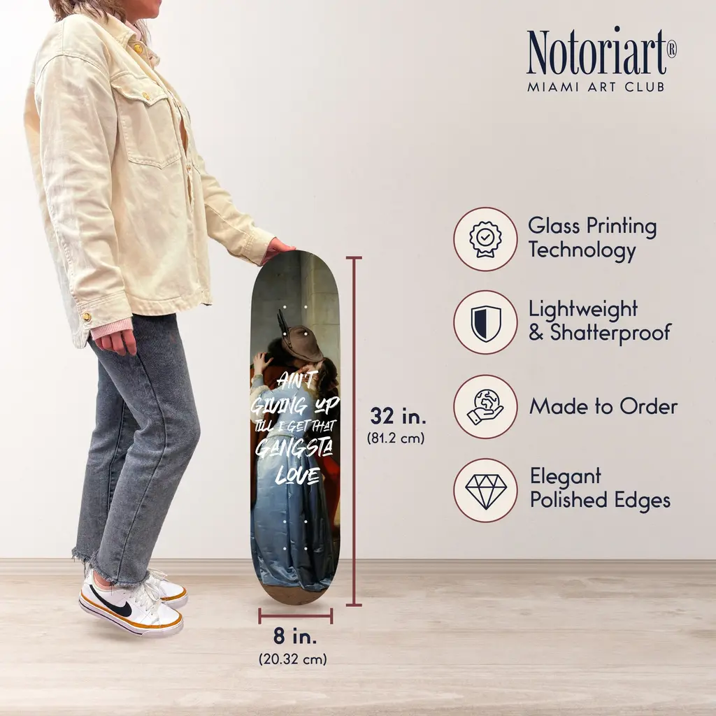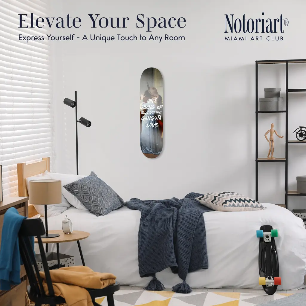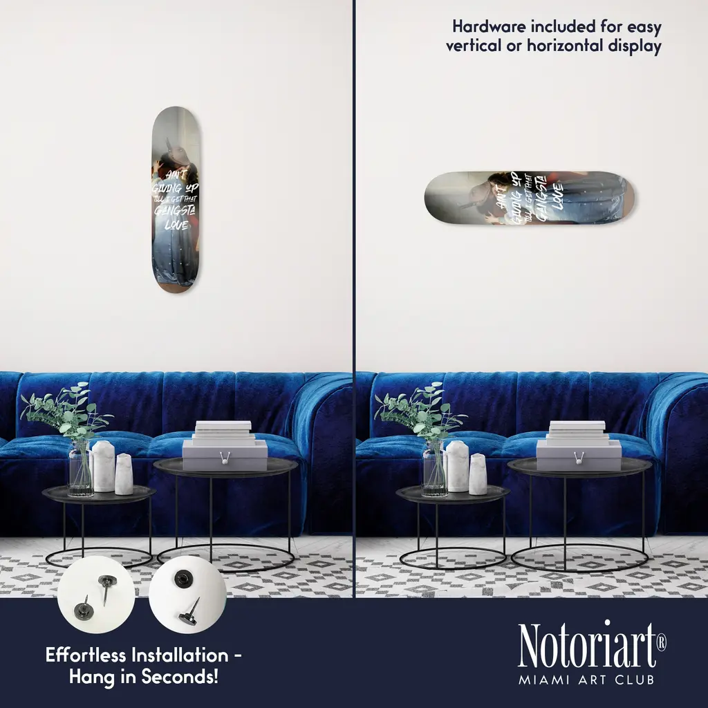 Elevate your decor with NOTORIART's Acrylic Glass Skateboard Wall Art. This 8" x 32" collectible masterpiece blends vibrant pop art with the essence of modern skate culture, crafted from precision-cut acrylic glass and hand-polished for a stunning finish. Featuring just 2 small holes, it comes with 4 durable aluminum thumbtacks (2 black, 2 silver) for effortless hanging—no complicated tools required. Ideal for skateboard enthusiasts and pop art collectors, this exclusive design is handmade to order in Miami, making it a unique statement piece for any urban space.Features: Interior Designer's Note: This collectible skateboard-shaped wall decor is crafted from precision-cut acrylic glass, featuring vibrant pop art designs that bring a playful energy to any space.Simple, Sleek Hanging Solution: With just 2 small holes and 4 sturdy aluminum thumbtacks provided (2 black, 2 silver), hanging this art is effortless. Push the thumbtacks into the wall—no tools or measuring needed.Pop Art-Inspired Style: Hand-polished to a glossy finish, this artwork captures the spirit of modern skate culture and urban art, making it a striking focal point for any room.Premium Materials & Secure Packaging: Made with high-quality acrylic glass, each piece is securely packaged to ensure it arrives in pristine, collectible condition. Size: 8" x 32"Exclusive NOTORIART Collectible: Handcrafted in Miami, this limited-edition skateboard art is perfect for skate enthusiasts and pop art lovers, offering a unique way to express individuality.To maintain its glossy finish, clean with a soft, dry microfiber cloth. Avoid using water or sprays. Suitable for indoor use only.