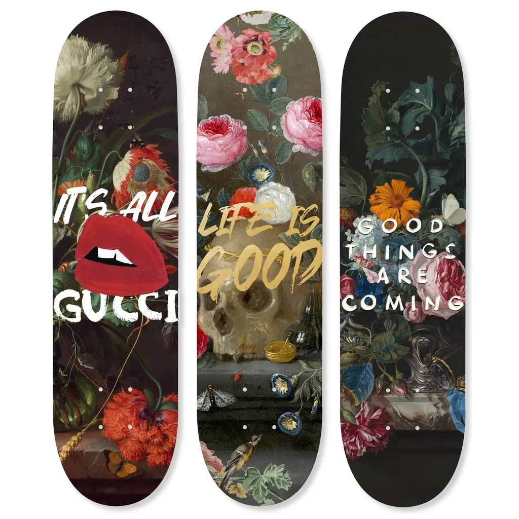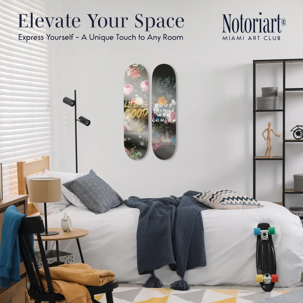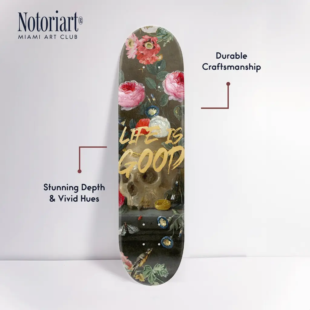 Elevate your decor with NOTORIART's Acrylic Glass Skateboard Wall Art. This 8" x 32" collectible masterpiece blends vibrant pop art with the essence of modern skate culture, crafted from precision-cut acrylic glass and hand-polished for a stunning finish. Featuring just 2 small holes, it comes with 4 durable aluminum thumbtacks (2 black, 2 silver) for effortless hanging—no complicated tools required. Ideal for skateboard enthusiasts and pop art collectors, this exclusive design is handmade to order in Miami, making it a unique statement piece for any urban space.Features: Interior Designer's Note: This collectible skateboard-shaped wall decor is crafted from precision-cut acrylic glass, featuring vibrant pop art designs that bring a playful energy to any space.Simple, Sleek Hanging Solution: With just 2 small holes and 4 sturdy aluminum thumbtacks provided (2 black, 2 silver), hanging this art is effortless. Push the thumbtacks into the wall—no tools or measuring needed.Pop Art-Inspired Style: Hand-polished to a glossy finish, this artwork captures the spirit of modern skate culture and urban art, making it a striking focal point for any room.Premium Materials & Secure Packaging: Made with high-quality acrylic glass, each piece is securely packaged to ensure it arrives in pristine, collectible condition. Size: 8" x 32"Exclusive NOTORIART Collectible: Handcrafted in Miami, this limited-edition skateboard art is perfect for skate enthusiasts and pop art lovers, offering a unique way to express individuality.To maintain its glossy finish, clean with a soft, dry microfiber cloth. Avoid using water or sprays. Suitable for indoor use only.