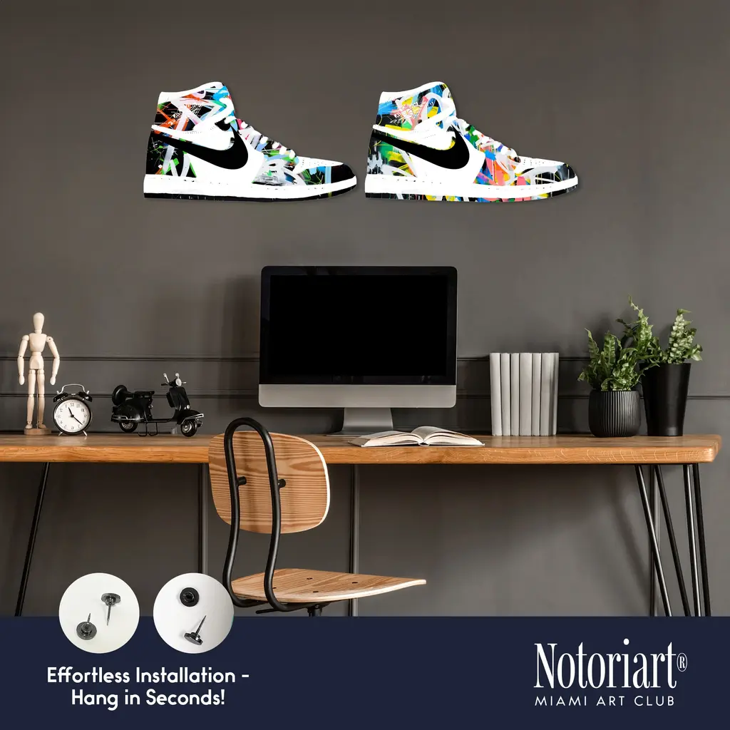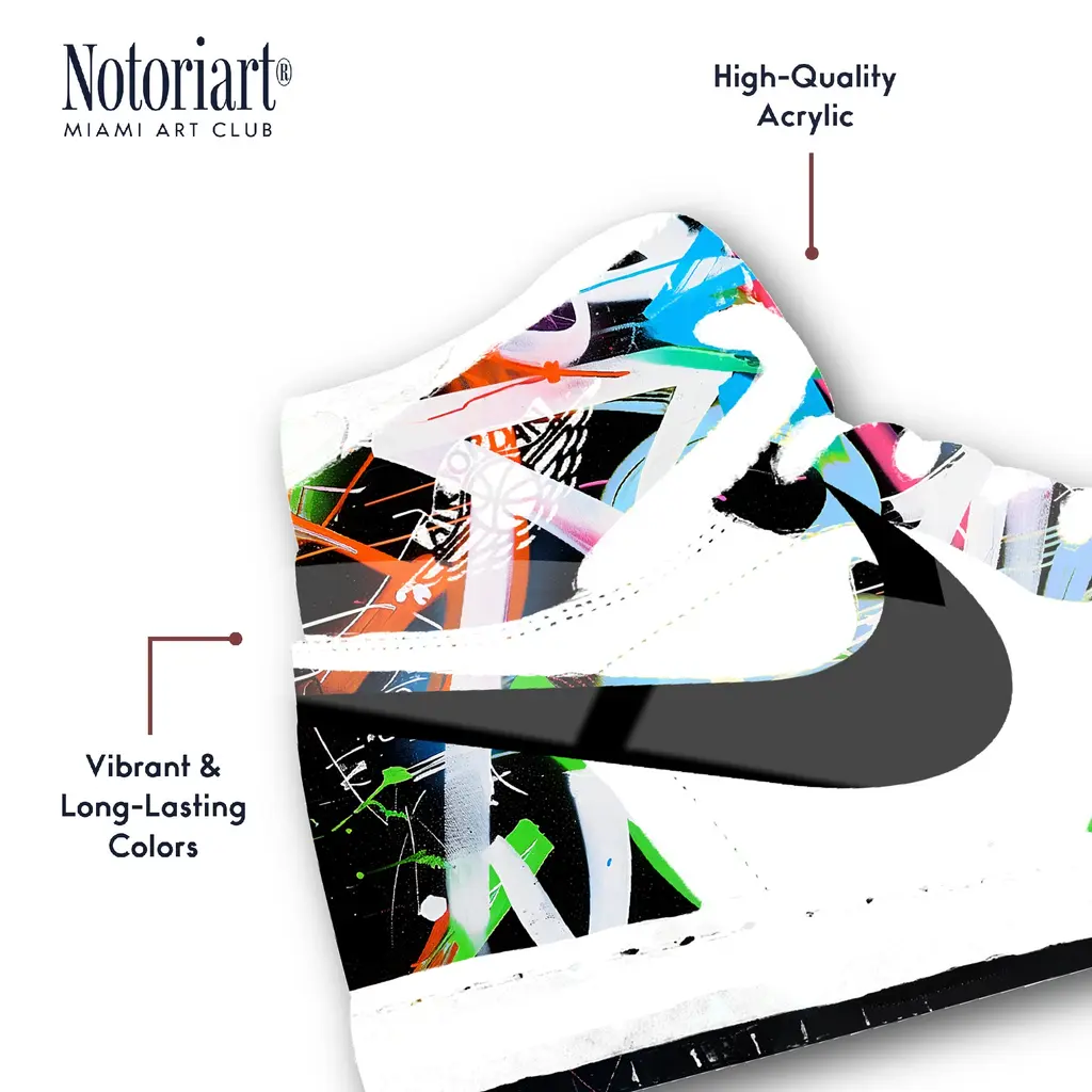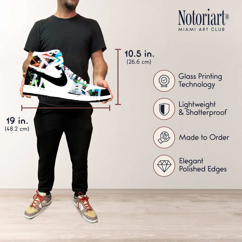 Discover the ultimate fusion of sneaker culture, street art, and high-end decor with NOTORIART's Acrylic Glass Sneaker Wall Art. This 19" x 10.5" masterpiece blends iconic sneaker designs with vibrant graffiti and hand-polished details. With just 2 small holes, this collectible piece includes 4 durable aluminum thumbtacks (2 black, 2 silver) for easy hanging—no complex tools needed. Ideal for sneakerheads and modern art collectors, this exclusive design is handmade to order in Miami, making it a bold statement piece for any space.Features: Interior Designer's Note: This collectible sneaker-shaped wall decor is crafted from precision-cut acrylic glass, showcasing vibrant graffiti elements and bold colors for a standout piece that energizes any room.Simple, Sleek Hanging Solution: With just 2 small holes and 4 sturdy aluminum thumbtacks provided (2 black, 2 silver), hanging this art is effortless. Push the thumbtacks into the wall—no drills or measuring required.Graffiti-Inspired Street Style: This high-quality, hand-polished acrylic glass art captures the raw energy of urban culture, making it a bold expression of modern street style and pop art.Premium Materials & Secure Packaging: Featuring a glossy, vibrant finish, each piece is securely packaged to ensure it arrives in flawless, collectible condition.Exclusive NOTORIART Collectible: Handcrafted in Miami, this limited-edition wall art is perfect for sneaker lovers and urban culture enthusiasts, serving as a unique expression of individuality.To preserve its high-gloss finish, clean with a soft, dry microfiber cloth. Avoid using water or sprays. Suitable for indoor use only.