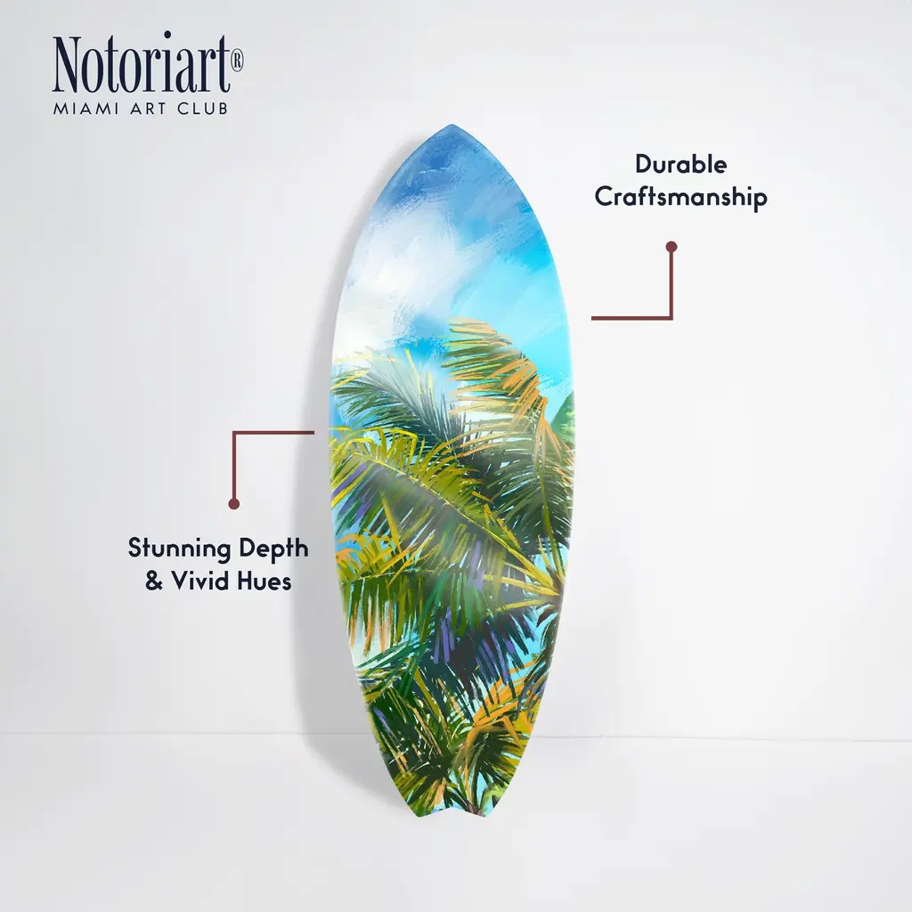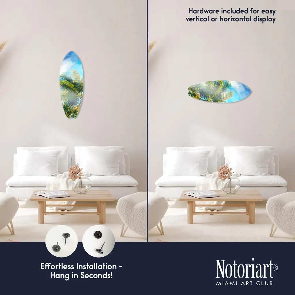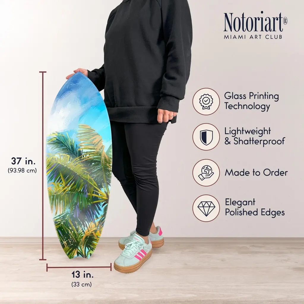Elevate your home decor with NOTORIART's bold and exclusive Acrylic Glass Skimboard Wall Art. Handcrafted in Miami and made-to-order, this decorative skimboard is more than just coastal decor—it's a statement piece designed to reflect your unique style. Made from high-quality die-cut acrylic glass, it boasts a vibrant, high-gloss finish that brings depth, movement, and life to any space. Whether you're looking to capture the essence of coastal living or seeking a modern art piece to enhance your room, this skimboard offers versatile display options, hanging both horizontally and vertically. Featuring just 2 small holes, it comes with 4 durable aluminum thumbtacks (2 black, 2 silver) for effortless hanging—no complicated tools required. Bring the essence of Miami's artistic flair into your home with a decor item that blends sophistication, authenticity, and individuality.Features: Interior Designers Note: Crafted from die-cut acrylic glass, this decorative skimboard brings bold, vibrant energy to any space. Its hand-polished, glass-like finish creates depth and movement, making it a standout piece in modern decor.Simple, Sleek Hanging Solution: With just 2 small holes and 4 sturdy aluminum thumbtacks provided (2 black, 2 silver), hanging this art is effortless. Push the thumbtacks into the wall—no tools or measuring needed.Handcrafted Excellence: Each piece is meticulously made to order in Miami, reflecting the unique style and quality of NOTORIART's designs. Our skilled artisans ensure attention to detail, producing a luxurious, standout decor item.Premium Materials & Secure Packaging: Constructed from high-quality die-cut acrylic glass with a vibrant, high-gloss finish, this skimboard arrives securely packaged to ensure it reaches you in pristine condition. Exclusive Statement Piece: Inspired by Miami's vibrant art scene, this decorative skimboard merges modern design with coastal influences. Ideal for any room, it brings a touch of refined elegance and individuality to your home or office.Wipe clean with a soft, dry microfiber cloth. Avoid using water or cleaning sprays to maintain the high-gloss finish. Not suitable for outdoor use.