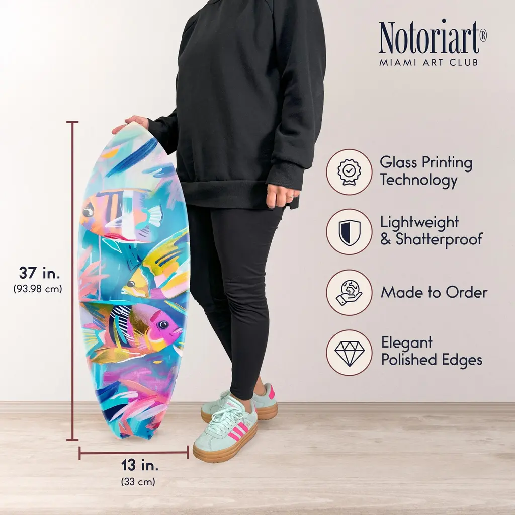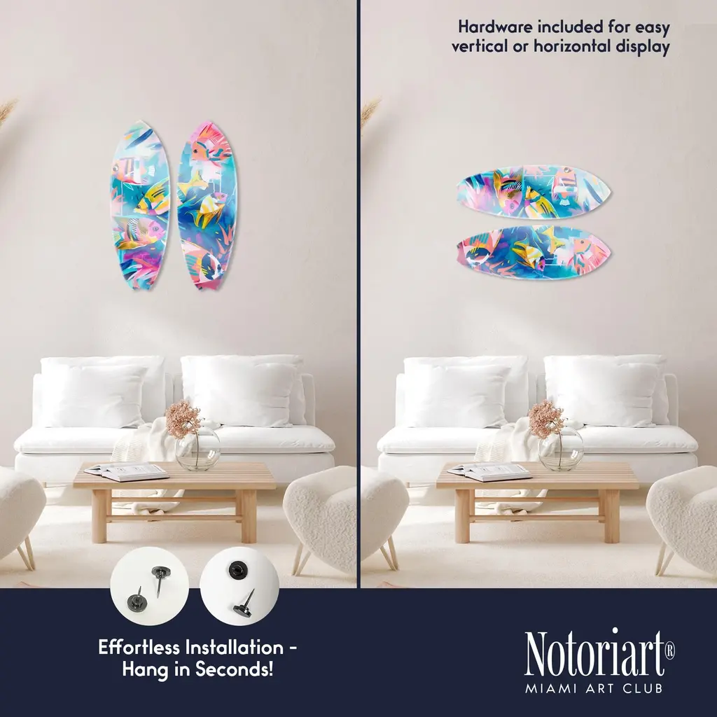 Elevate your home decor with NOTORIART's bold and exclusive Acrylic Glass Skimboard Wall Art. Handcrafted in Miami and made-to-order, this decorative skimboard is more than just coastal decor—it's a statement piece designed to reflect your unique style. Made from high-quality die-cut acrylic glass, it boasts a vibrant, high-gloss finish that brings depth, movement, and life to any space. Whether you're looking to capture the essence of coastal living or seeking a modern art piece to enhance your room, this skimboard offers versatile display options, hanging both horizontally and vertically. Featuring just 2 small holes, it comes with 4 durable aluminum thumbtacks (2 black, 2 silver) for effortless hanging—no complicated tools required. Bring the essence of Miami's artistic flair into your home with a decor item that blends sophistication, authenticity, and individuality.Features: Interior Designers Note: Crafted from die-cut acrylic glass, this decorative skimboard brings bold, vibrant energy to any space. Its hand-polished, glass-like finish creates depth and movement, making it a standout piece in modern decor.Simple, Sleek Hanging Solution: With just 2 small holes and 4 sturdy aluminum thumbtacks provided (2 black, 2 silver), hanging this art is effortless. Push the thumbtacks into the wall—no tools or measuring needed.Handcrafted Excellence: Each piece is meticulously made to order in Miami, reflecting the unique style and quality of NOTORIART's designs. Our skilled artisans ensure attention to detail, producing a luxurious, standout decor item.Premium Materials & Secure Packaging: Constructed from high-quality die-cut acrylic glass with a vibrant, high-gloss finish, this skimboard arrives securely packaged to ensure it reaches you in pristine condition. Exclusive Statement Piece: Inspired by Miami's vibrant art scene, this decorative skimboard merges modern design with coastal influences. Ideal for any room, it brings a touch of refined elegance and individuality to your home or office.Wipe clean with a soft, dry microfiber cloth. Avoid using water or cleaning sprays to maintain the high-gloss finish. Not suitable for outdoor use.