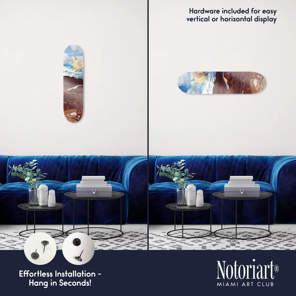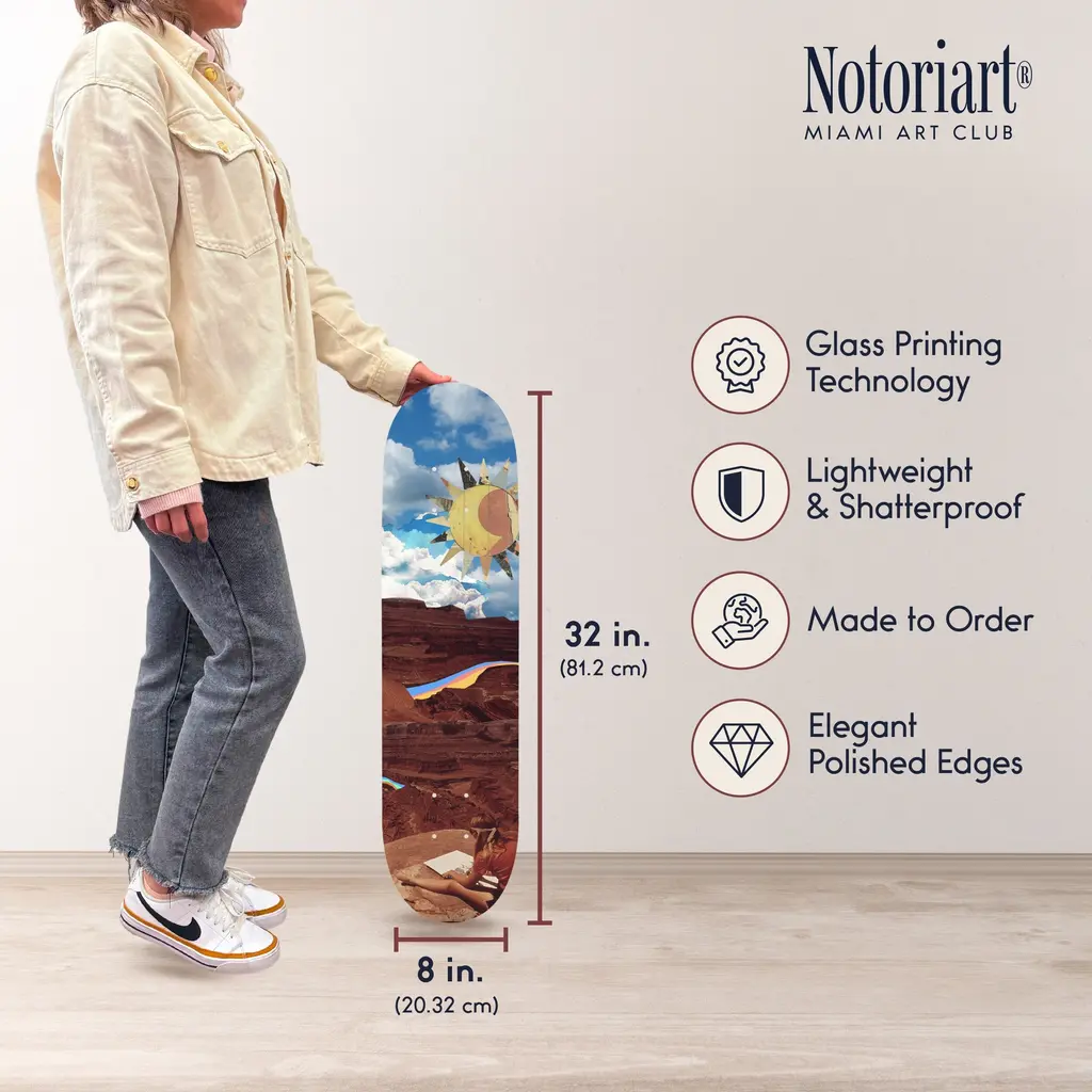 Elevate your decor with NOTORIART's Acrylic Glass Skateboard Wall Art. This 8" x 32" collectible masterpiece blends vibrant pop art with the essence of modern skate culture, crafted from precision-cut acrylic glass and hand-polished for a stunning finish. Featuring just 2 small holes, it comes with 4 durable aluminum thumbtacks (2 black, 2 silver) for effortless hanging—no complicated tools required. Ideal for skateboard enthusiasts and pop art collectors, this exclusive design is handmade to order in Miami, making it a unique statement piece for any urban space.Features: Interior Designer's Note: This collectible skateboard-shaped wall decor is crafted from precision-cut acrylic glass, featuring vibrant pop art designs that bring a playful energy to any space.Simple, Sleek Hanging Solution: With just 2 small holes and 4 sturdy aluminum thumbtacks provided (2 black, 2 silver), hanging this art is effortless. Push the thumbtacks into the wall—no tools or measuring needed.Pop Art-Inspired Style: Hand-polished to a glossy finish, this artwork captures the spirit of modern skate culture and urban art, making it a striking focal point for any room.Premium Materials & Secure Packaging: Made with high-quality acrylic glass, each piece is securely packaged to ensure it arrives in pristine, collectible condition. Size: 8" x 32"Exclusive NOTORIART Collectible: Handcrafted in Miami, this limited-edition skateboard art is perfect for skate enthusiasts and pop art lovers, offering a unique way to express individuality.To maintain its glossy finish, clean with a soft, dry microfiber cloth. Avoid using water or sprays. Suitable for indoor use only.