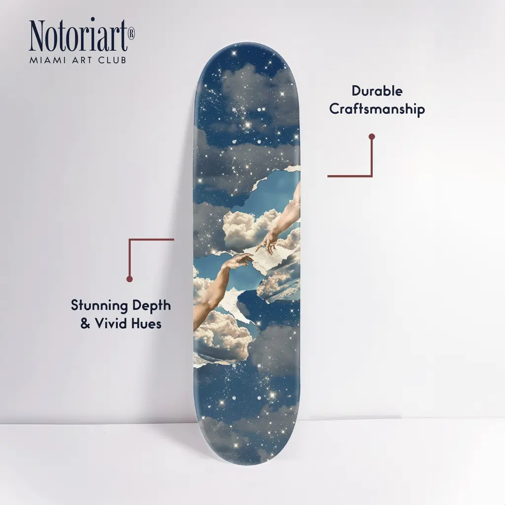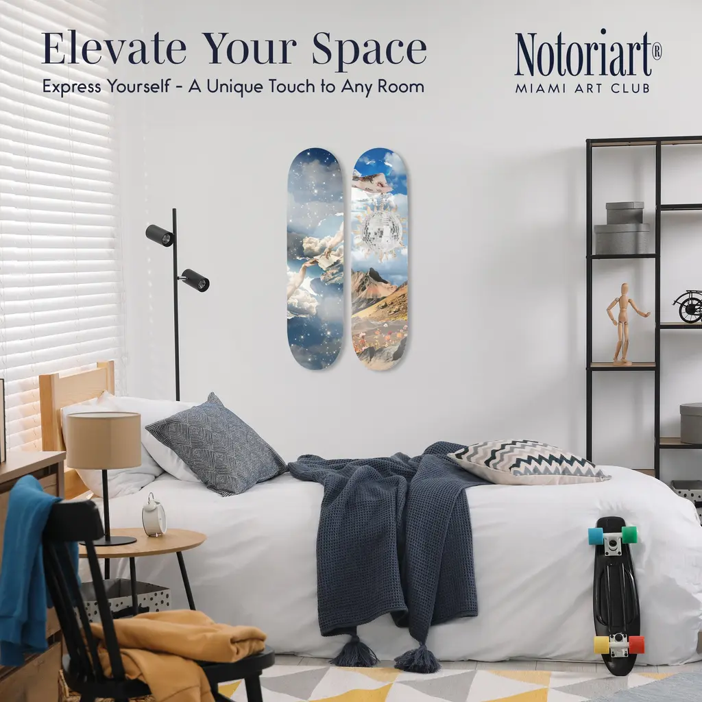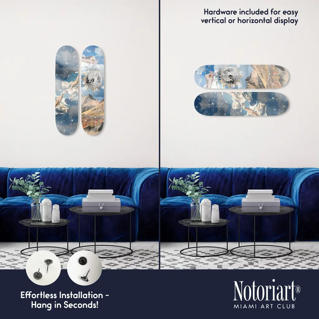 Elevate your decor with NOTORIART's Acrylic Glass Skateboard Wall Art. This 8" x 32" collectible masterpiece blends vibrant pop art with the essence of modern skate culture, crafted from precision-cut acrylic glass and hand-polished for a stunning finish. Featuring just 2 small holes, it comes with 4 durable aluminum thumbtacks (2 black, 2 silver) for effortless hanging—no complicated tools required. Ideal for skateboard enthusiasts and pop art collectors, this exclusive design is handmade to order in Miami, making it a unique statement piece for any urban space.Features: Interior Designer's Note: This collectible skateboard-shaped wall decor is crafted from precision-cut acrylic glass, featuring vibrant pop art designs that bring a playful energy to any space.Simple, Sleek Hanging Solution: With just 2 small holes and 4 sturdy aluminum thumbtacks provided (2 black, 2 silver), hanging this art is effortless. Push the thumbtacks into the wall—no tools or measuring needed.Pop Art-Inspired Style: Hand-polished to a glossy finish, this artwork captures the spirit of modern skate culture and urban art, making it a striking focal point for any room.Premium Materials & Secure Packaging: Made with high-quality acrylic glass, each piece is securely packaged to ensure it arrives in pristine, collectible condition. Size: 8" x 32"Exclusive NOTORIART Collectible: Handcrafted in Miami, this limited-edition skateboard art is perfect for skate enthusiasts and pop art lovers, offering a unique way to express individuality.To maintain its glossy finish, clean with a soft, dry microfiber cloth. Avoid using water or sprays. Suitable for indoor use only.