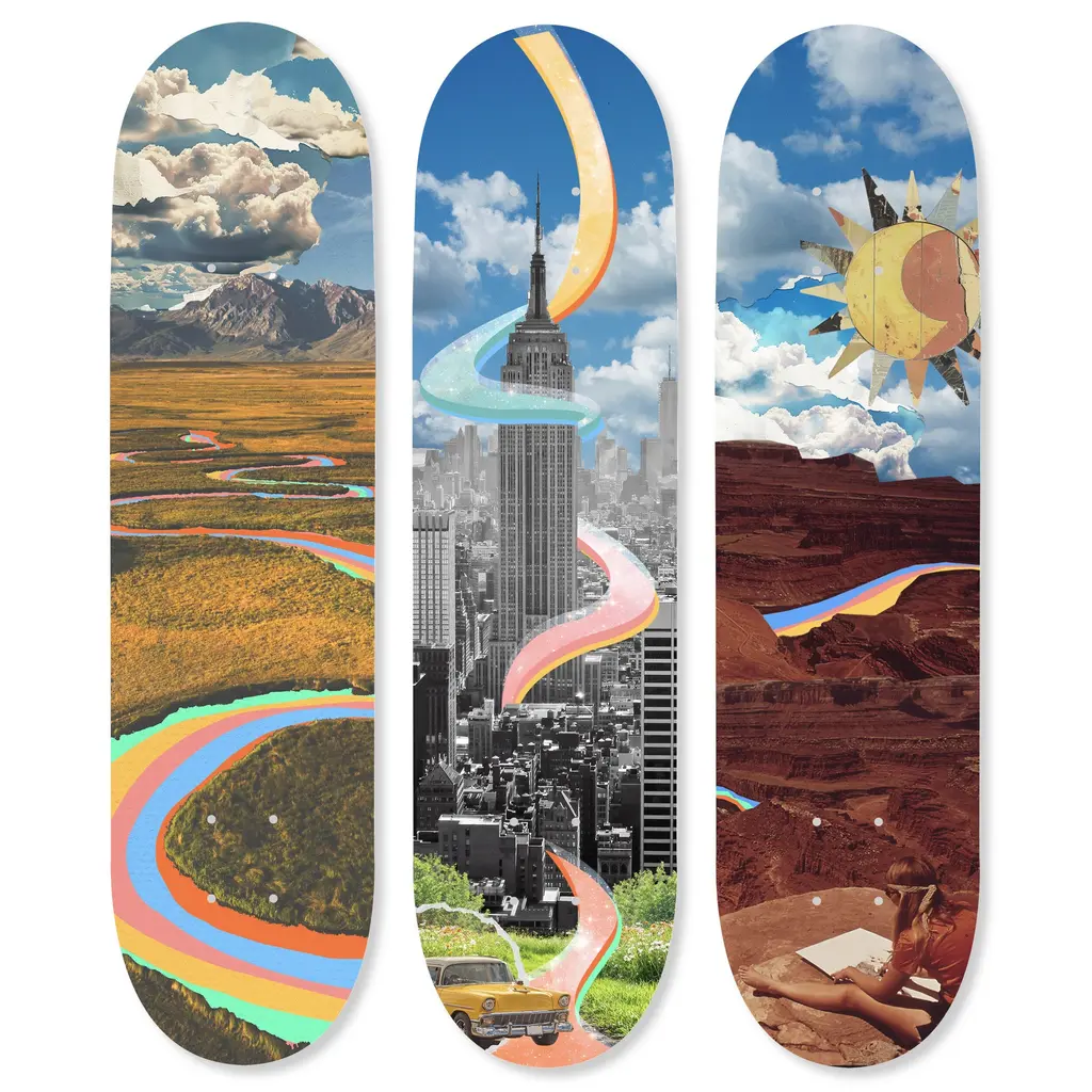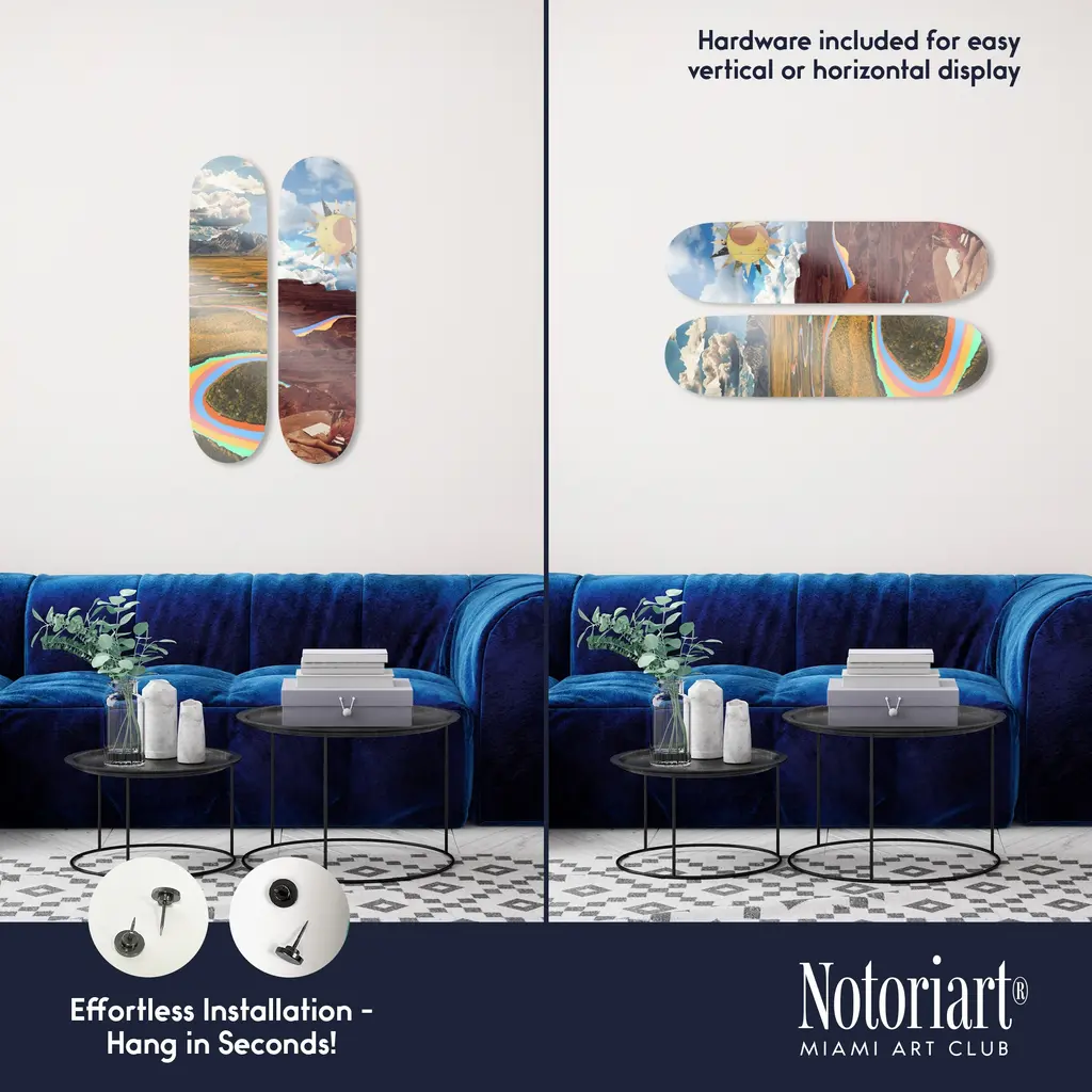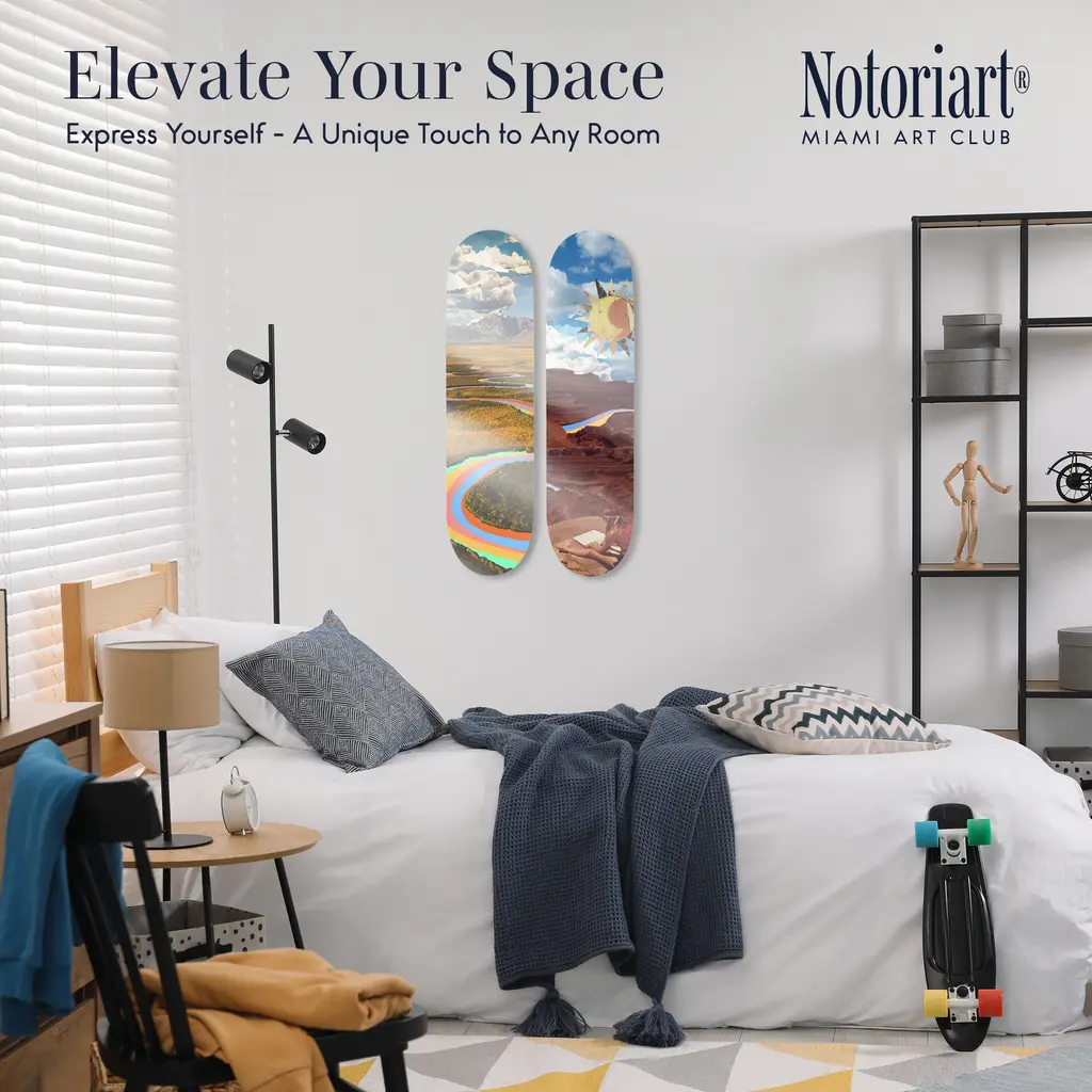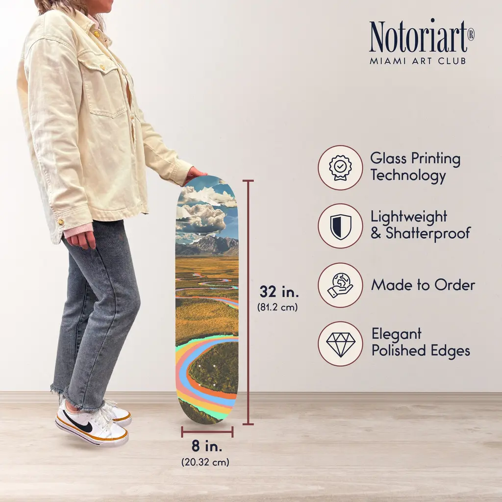 Elevate your decor with NOTORIART's Acrylic Glass Skateboard Wall Art. This 8" x 32" collectible masterpiece blends vibrant pop art with the essence of modern skate culture, crafted from precision-cut acrylic glass and hand-polished for a stunning finish. Featuring just 2 small holes, it comes with 4 durable aluminum thumbtacks (2 black, 2 silver) for effortless hanging—no complicated tools required. Ideal for skateboard enthusiasts and pop art collectors, this exclusive design is handmade to order in Miami, making it a unique statement piece for any urban space.Features: Interior Designer's Note: This collectible skateboard-shaped wall decor is crafted from precision-cut acrylic glass, featuring vibrant pop art designs that bring a playful energy to any space.Simple, Sleek Hanging Solution: With just 2 small holes and 4 sturdy aluminum thumbtacks provided (2 black, 2 silver), hanging this art is effortless. Push the thumbtacks into the wall—no tools or measuring needed.Pop Art-Inspired Style: Hand-polished to a glossy finish, this artwork captures the spirit of modern skate culture and urban art, making it a striking focal point for any room.Premium Materials & Secure Packaging: Made with high-quality acrylic glass, each piece is securely packaged to ensure it arrives in pristine, collectible condition. Size: 8" x 32"Exclusive NOTORIART Collectible: Handcrafted in Miami, this limited-edition skateboard art is perfect for skate enthusiasts and pop art lovers, offering a unique way to express individuality.To maintain its glossy finish, clean with a soft, dry microfiber cloth. Avoid using water or sprays. Suitable for indoor use only.