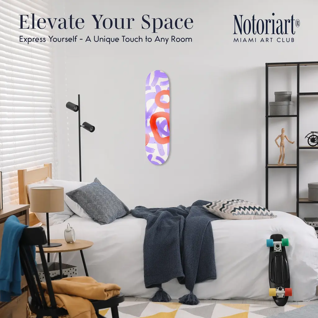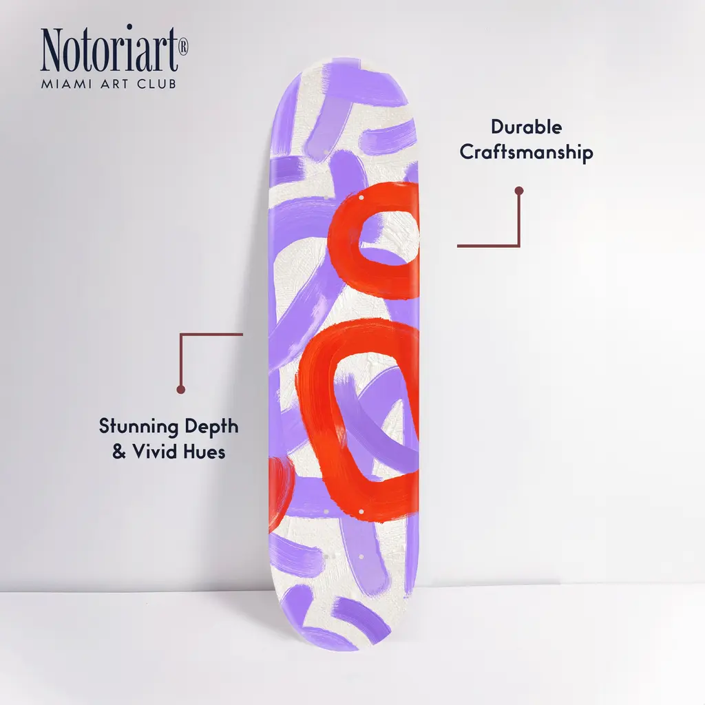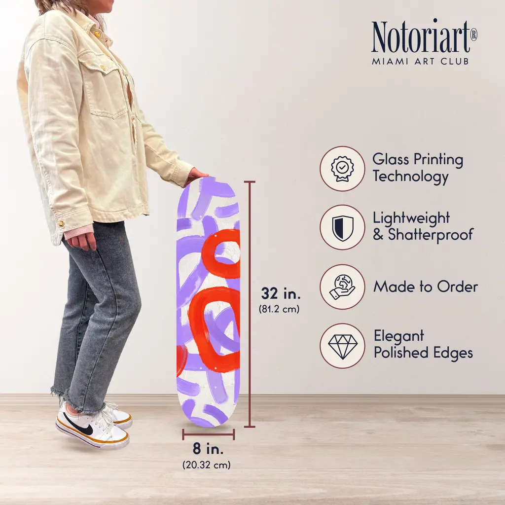 Elevate your decor with NOTORIART's Acrylic Glass Skateboard Wall Art. This 8" x 32" collectible masterpiece blends vibrant pop art with the essence of modern skate culture, crafted from precision-cut acrylic glass and hand-polished for a stunning finish. Featuring just 2 small holes, it comes with 4 durable aluminum thumbtacks (2 black, 2 silver) for effortless hanging—no complicated tools required. Ideal for skateboard enthusiasts and pop art collectors, this exclusive design is handmade to order in Miami, making it a unique statement piece for any urban space.Features: Interior Designer's Note: This collectible skateboard-shaped wall decor is crafted from precision-cut acrylic glass, featuring vibrant pop art designs that bring a playful energy to any space.Simple, Sleek Hanging Solution: With just 2 small holes and 4 sturdy aluminum thumbtacks provided (2 black, 2 silver), hanging this art is effortless. Push the thumbtacks into the wall—no tools or measuring needed.Pop Art-Inspired Style: Hand-polished to a glossy finish, this artwork captures the spirit of modern skate culture and urban art, making it a striking focal point for any room.Premium Materials & Secure Packaging: Made with high-quality acrylic glass, each piece is securely packaged to ensure it arrives in pristine, collectible condition. Size: 8" x 32"Exclusive NOTORIART Collectible: Handcrafted in Miami, this limited-edition skateboard art is perfect for skate enthusiasts and pop art lovers, offering a unique way to express individuality.To maintain its glossy finish, clean with a soft, dry microfiber cloth. Avoid using water or sprays. Suitable for indoor use only.