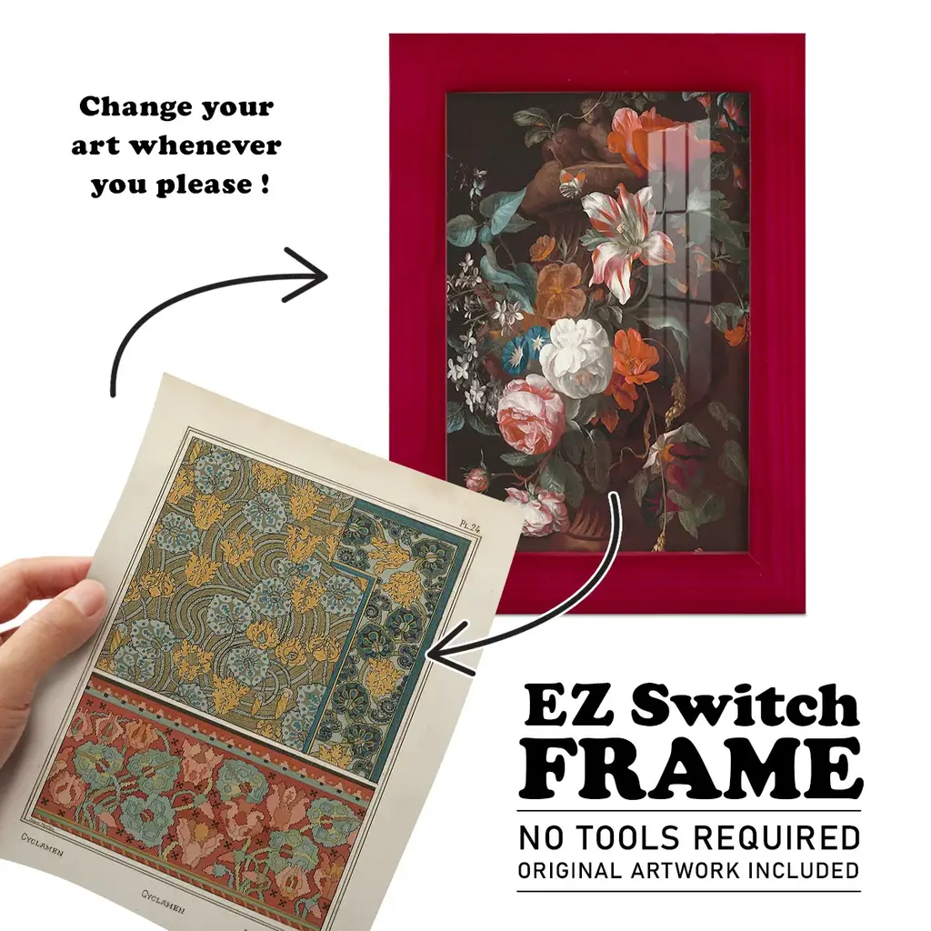 Nouveau Decorative I -EZ SWITCH Framed Print w/glass-Cherry Red A delightful, framed print. Featuring a solid wood frame with real wood glass. This premium print is giclee quality. In addition, every frame features a removable back and table top stand. This allows you to change your art in the future or to just stand the art on a table for a new look. We are sure you'll enjoy our new series of EZ SWITCH Framed Art. Solid Wood Frame Real Glass Removable / Replaceable Art Built in Tabletop Stand Sizes range from 4x6 up to 12x15 - buy just one or pair them up as sets as you see fit.
