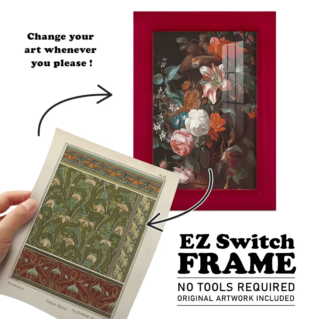 Nouveau Decorative VI -EZ SWITCH Framed Print w/glass-Cherry Red A delightful, framed print. Featuring a solid wood frame with real wood glass. This premium print is giclee quality. In addition, every frame features a removable back and table top stand. This allows you to change your art in the future or to just stand the art on a table for a new look. We are sure you'll enjoy our new series of EZ SWITCH Framed Art. Solid Wood Frame Real Glass Removable / Replaceable Art Built in Tabletop Stand Sizes range from 4x6 up to 12x15 - buy just one or pair them up as sets as you see fit.