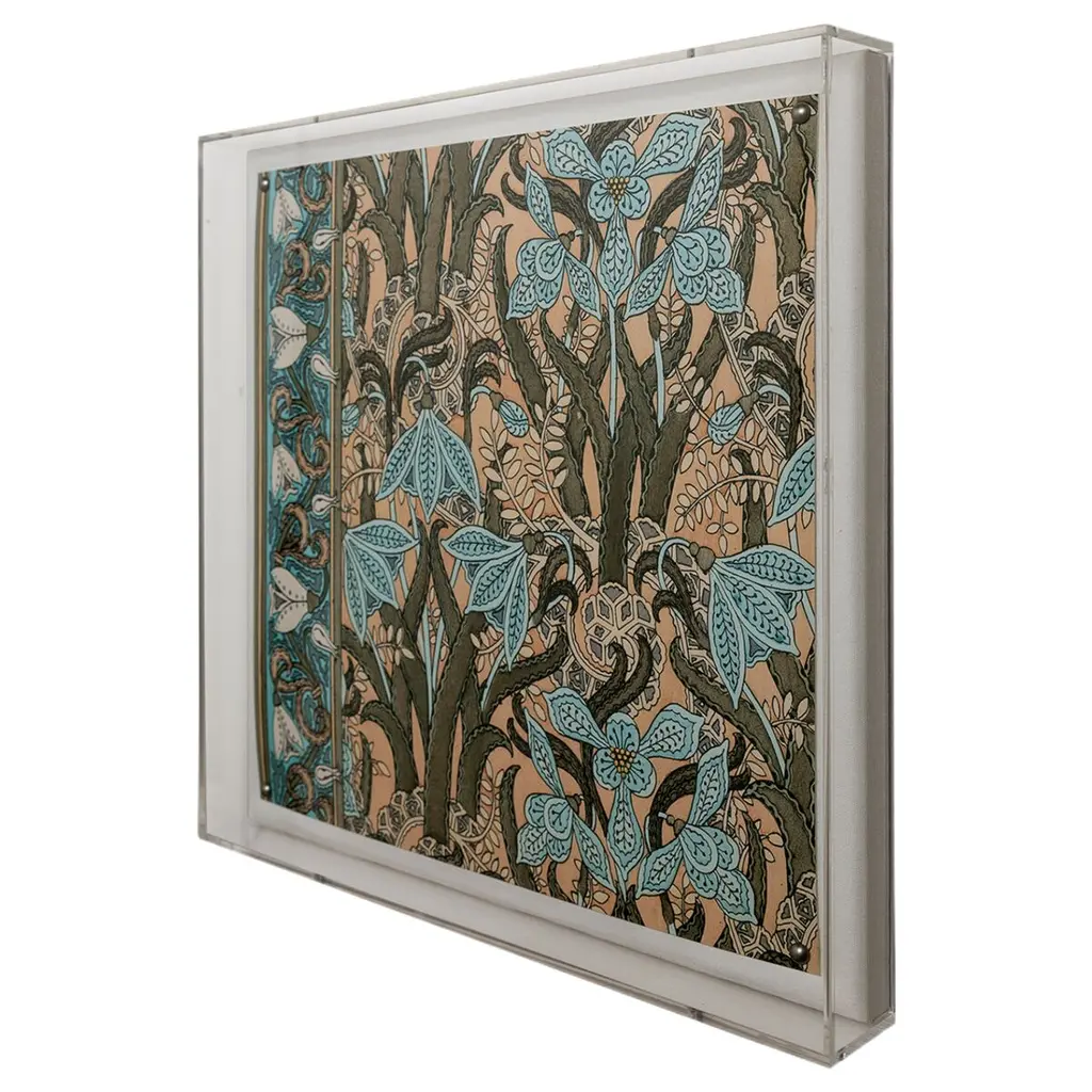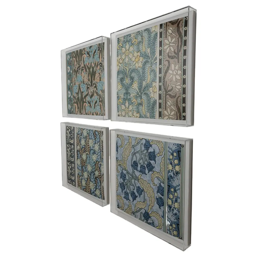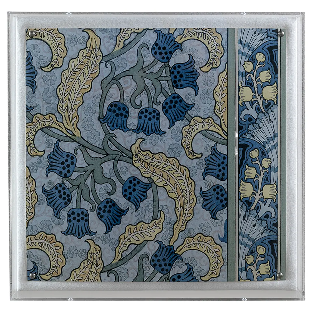 Nouveau is a series of four antique floral tiles in the manner of the art nouveau style and design. Our giclee prints are reproductions from an artist interpretation of the ceramic tiles. The tiles layer together as a set or individually on the wall as artwork. Featuring a giclee print mounted under a 2.5" deep clear lucite shadow box, the Nouveau print is attached to a linen wrapped interior panel and finished with black nail head in each corner. Each panel is sold individually. Artwork may be hung individually, and as a series of four engravings. Measurements: 20"H x 20"W x 2.5"D Materials: acrylic frame, interior board mount, giclee paper print.
