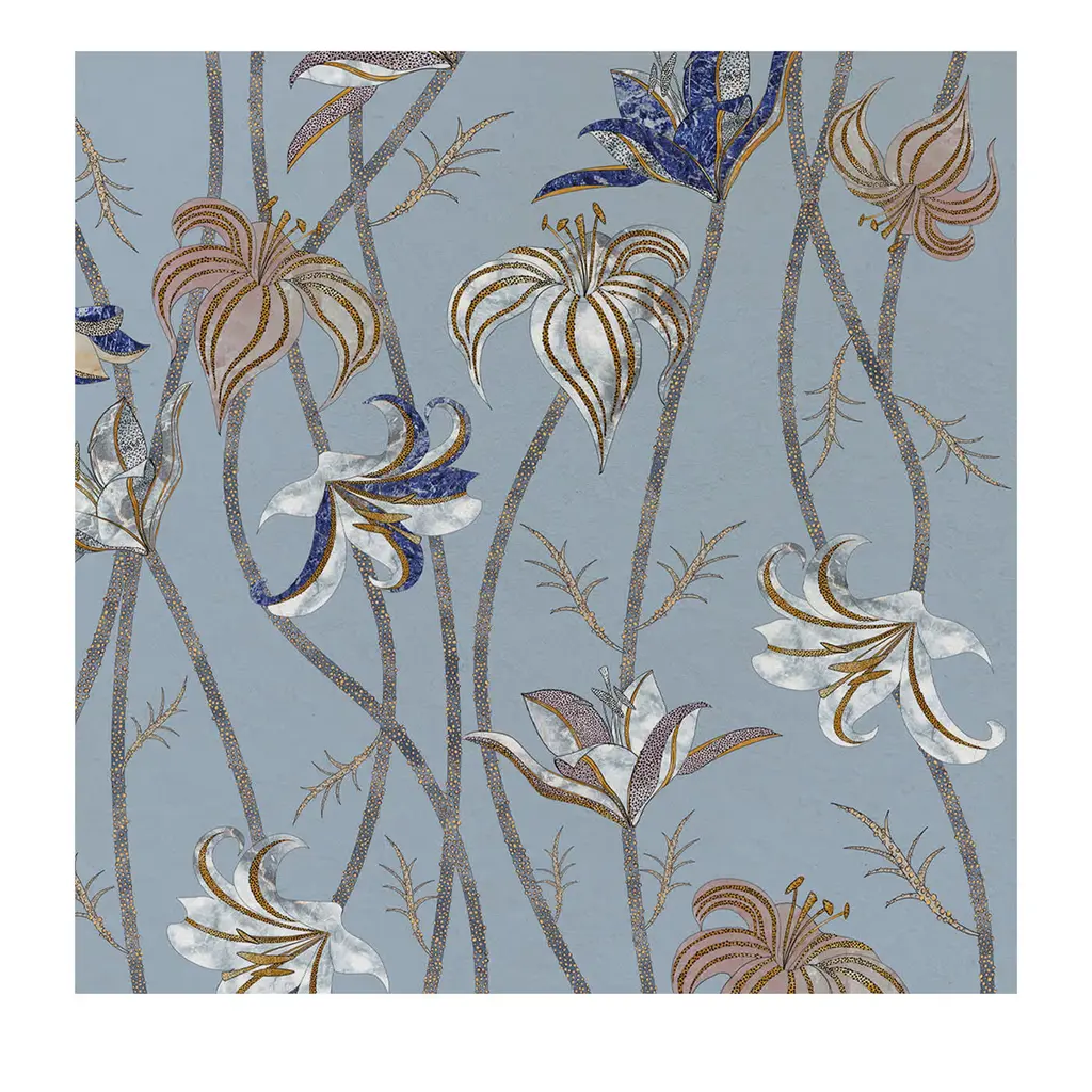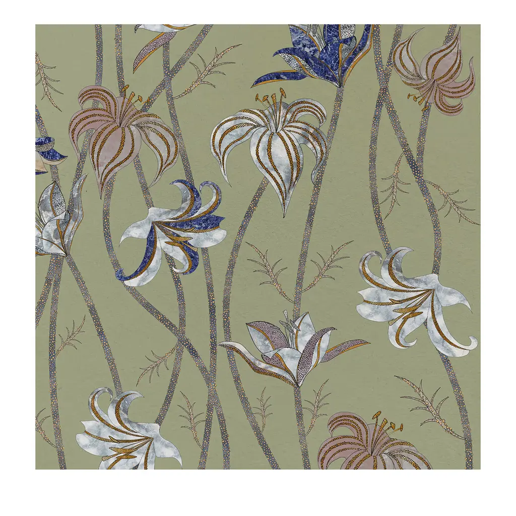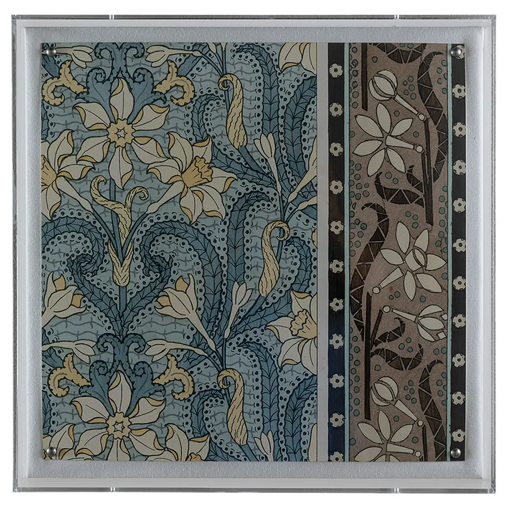Nouveau is a series of four antique floral tiles in the manner of the art nouveau style and design. Our giclee prints are reproductions from an artist interpretation of the ceramic tiles. The tiles layer together as a set or individually on the wall as artwork. Featuring a giclee print mounted under a 2.5" deep clear lucite shadow box, the Nouveau print is attached to a linen wrapped interior panel and finished with black nail head in each corner. Each panel is sold individually. Artwork may be hung individually, and as a series of four engravings. Measurements: 20"H x 20"W x 2.5"D Materials: acrylic frame, interior board mount, giclee paper print.