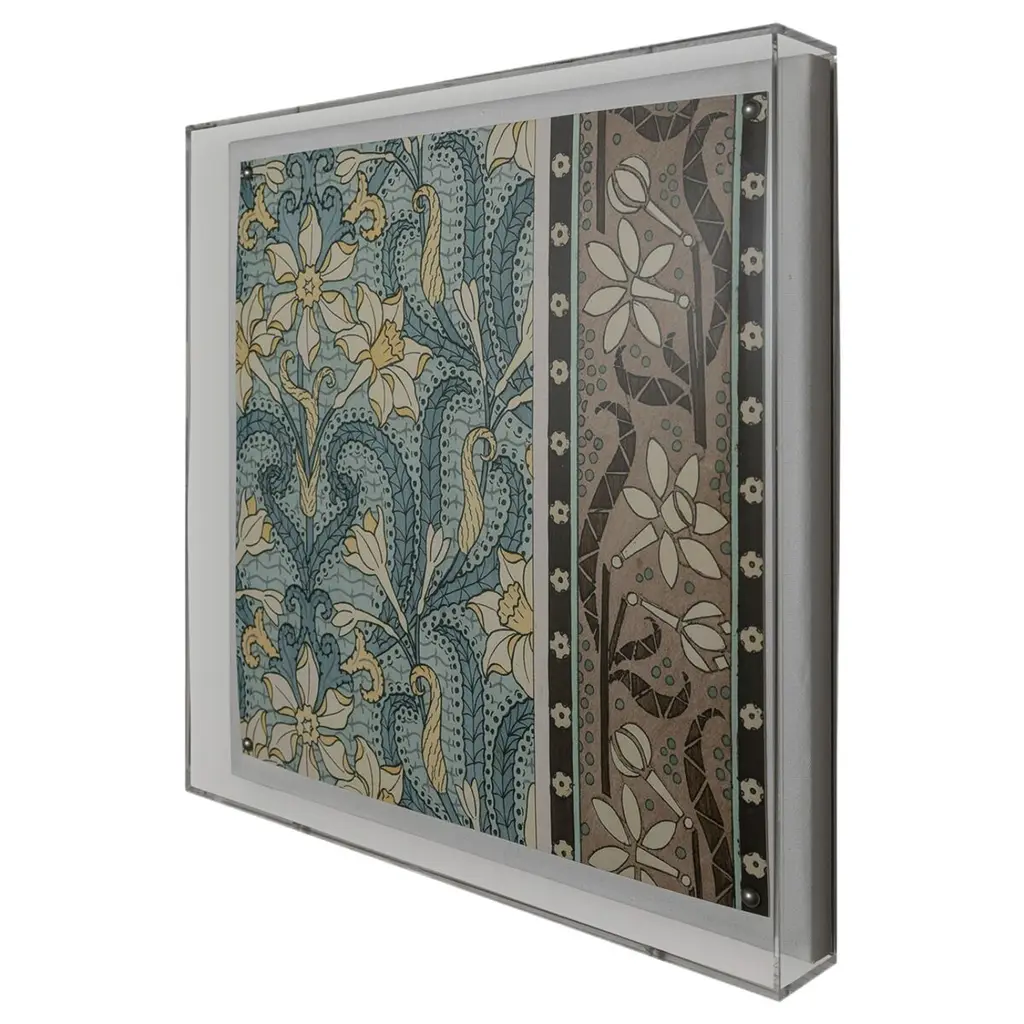 Nouveau is a series of four antique floral tiles in the manner of the art nouveau style and design. Our giclee prints are reproductions from an artist interpretation of the ceramic tiles. The tiles layer together as a set or individually on the wall as artwork. Featuring a giclee print mounted under a 2.5" deep clear lucite shadow box, the Nouveau print is attached to a linen wrapped interior panel and finished with black nail head in each corner. Each panel is sold individually. Artwork may be hung individually, and as a series of four engravings. Measurements: 20"H x 20"W x 2.5"D Materials: acrylic frame, interior board mount, giclee paper print.