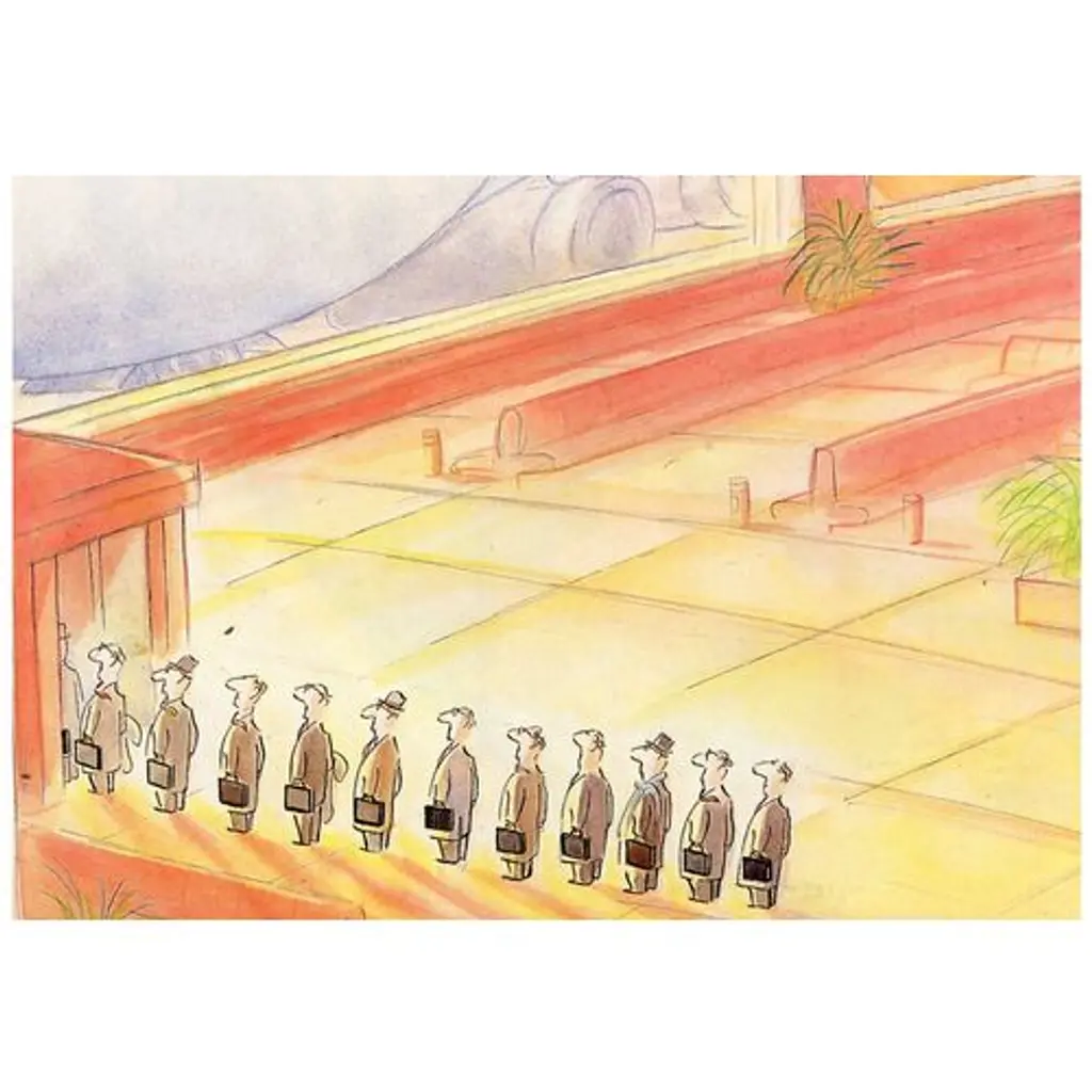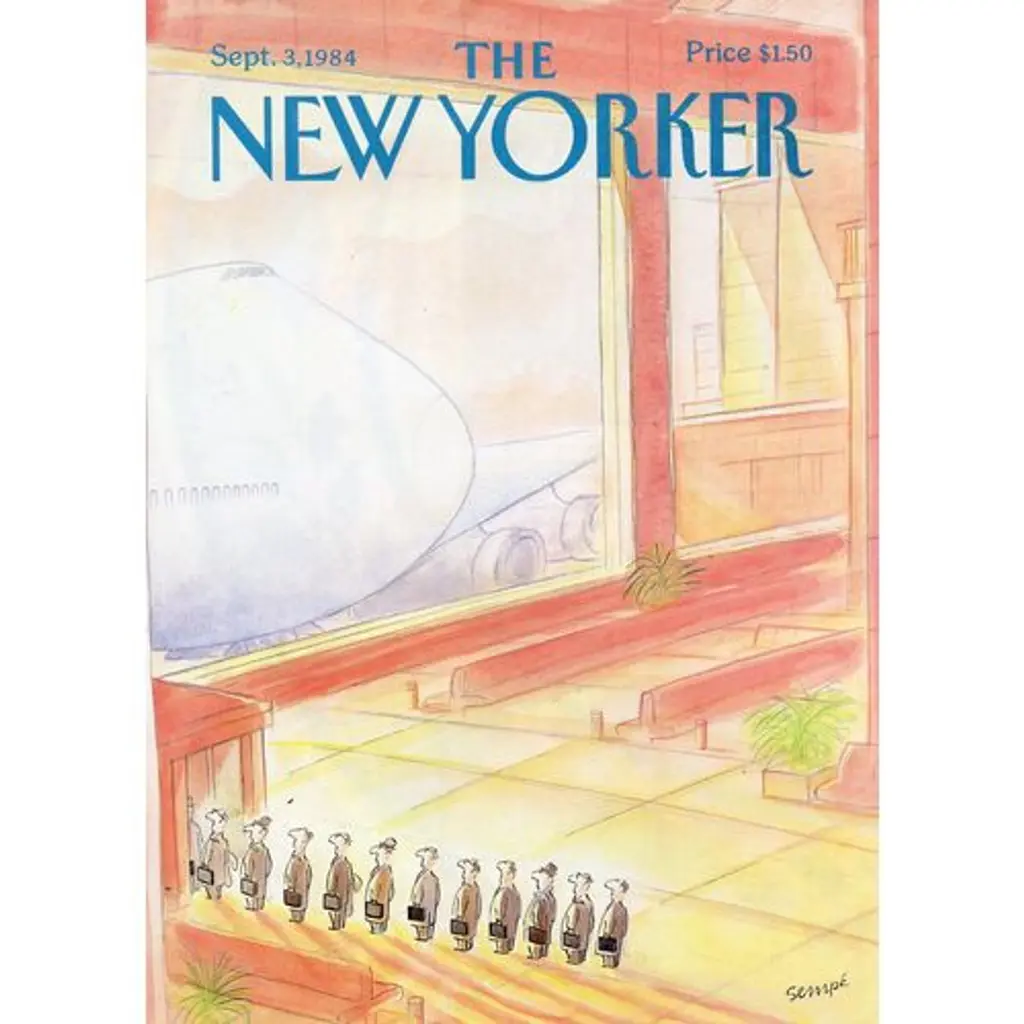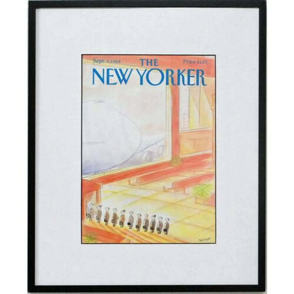Original New Yorker cover from September 3, 1984. Based on an illustration by the French cartoonist Jean-Jacques Sempe (b. 1932). Displayed in a conservation mat in a black metal frame under ultraviolet conservation glass. Image: 8"L x 11"H; overall: 13"L x 16"H. This beautifully framed original New Yorker cover arrives ready to hang. Includes a certificate with additional information and a brief history of New Yorker magazine cover art.