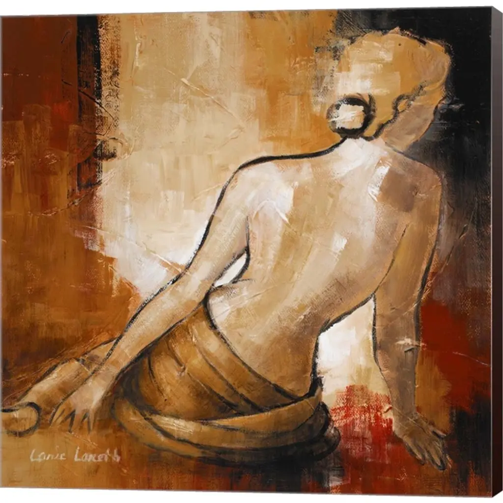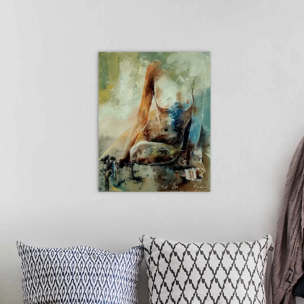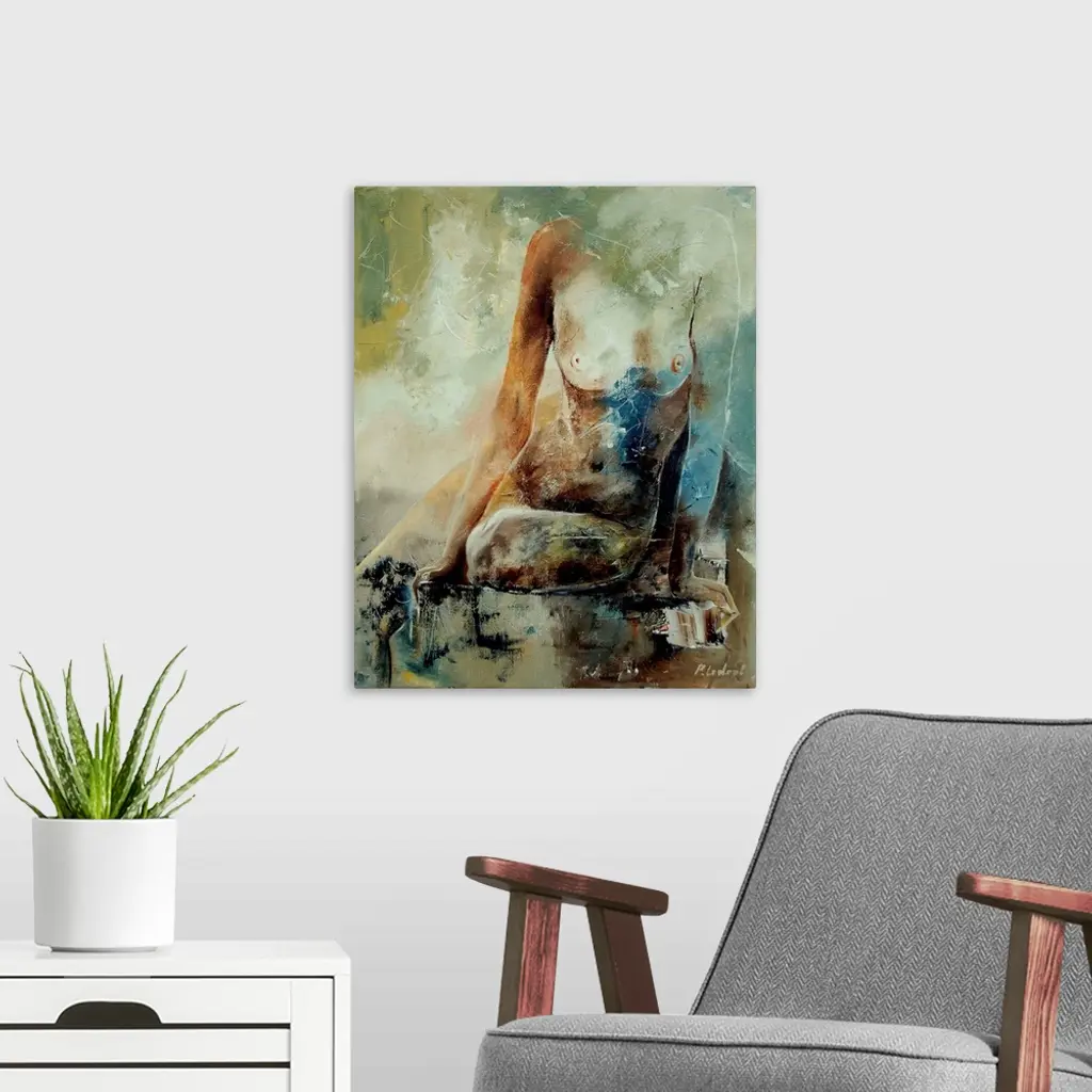 A nude painting of a woman sitting from the shoulders down in textured neutral colors of gray, brown, blue and green.